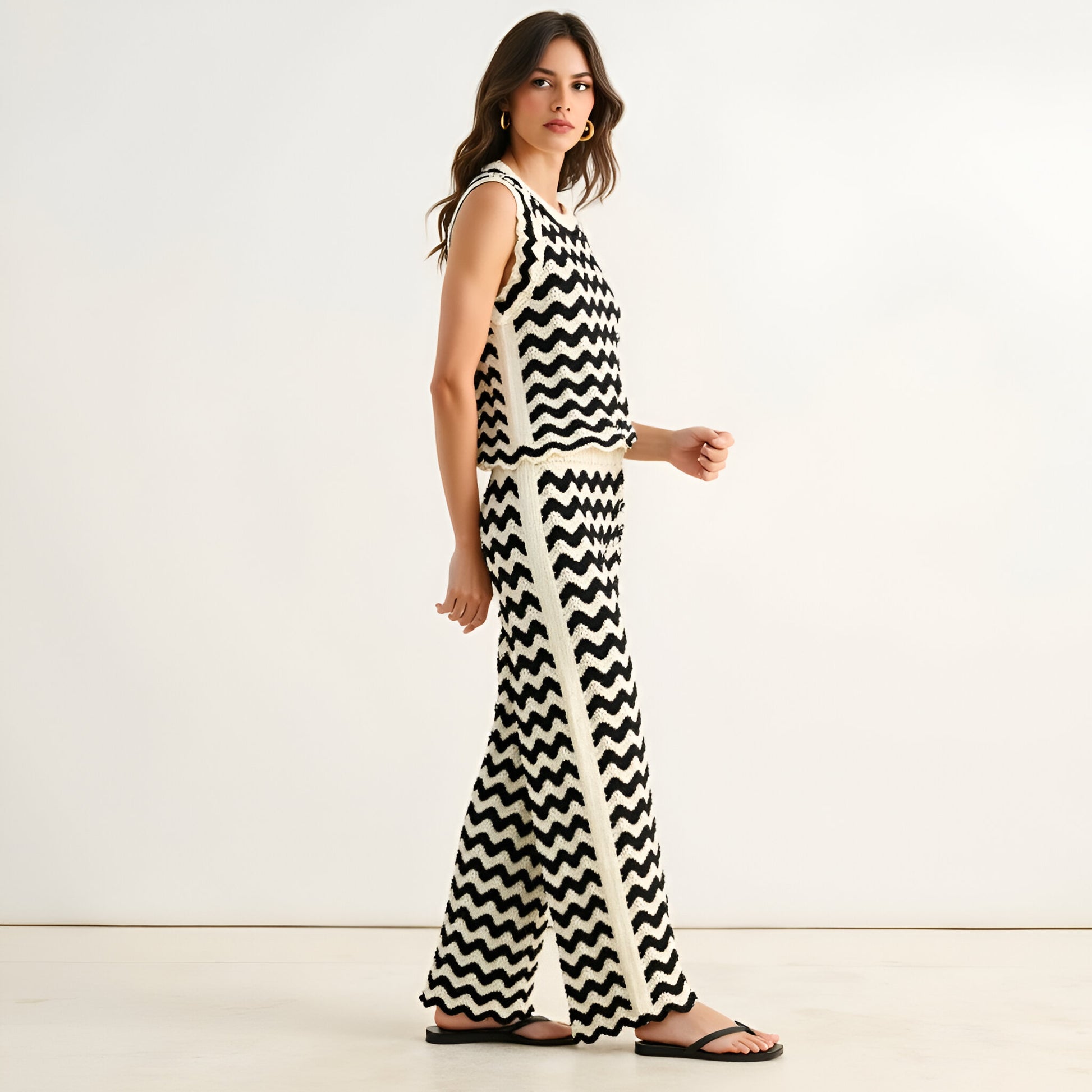 Chevron Crochet Wide Leg Pants with Contrast Trim and High Waist