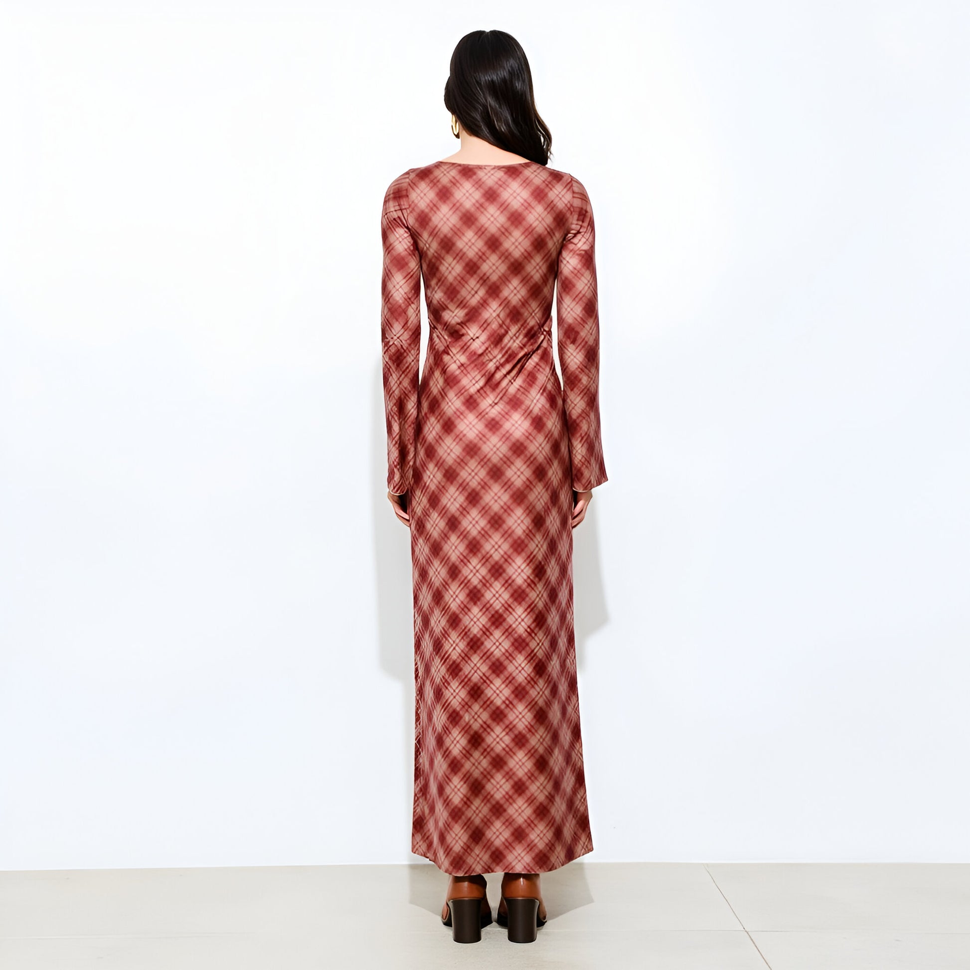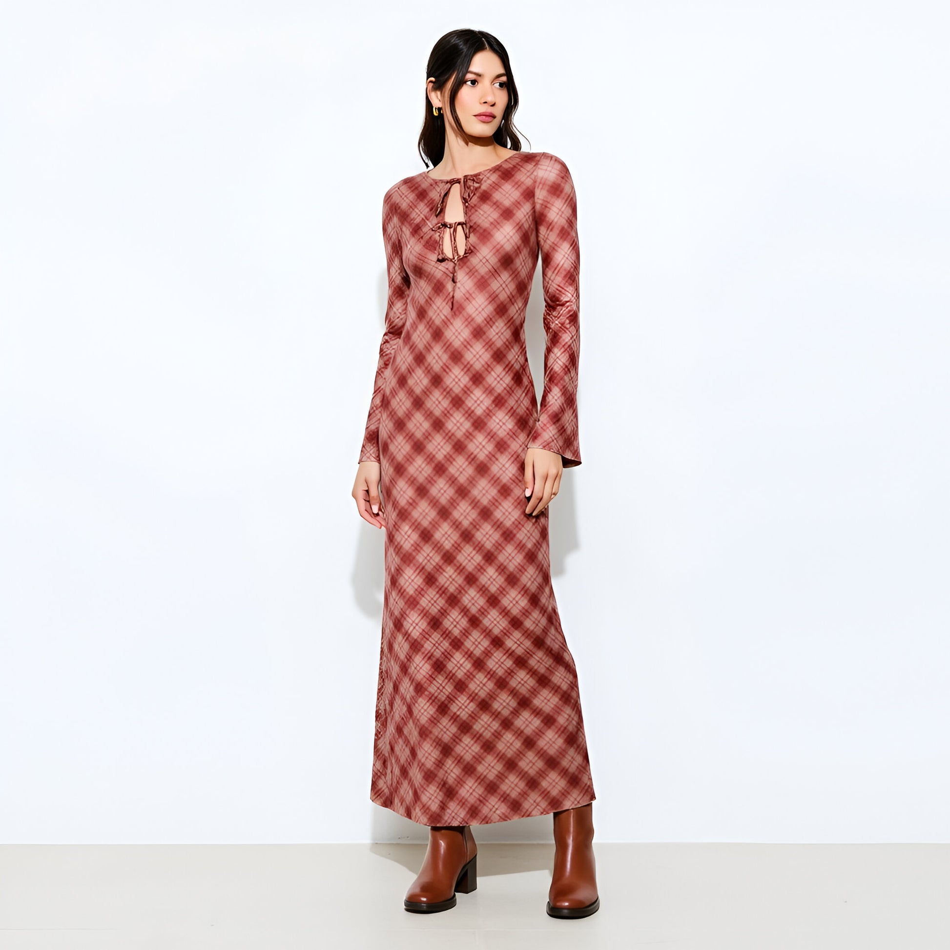 This plaid long sleeve maxi dress offers a modern twist on classic checks, featuring a front tie keyhole neckline and softly flared cuffs for added style. The streamlined silhouette skims the figure and falls to a full-length hem, creating an effortlessly polished look. Crafted from a lightweight, comfortable fabric with gentle drape, this dress pairs perfectly with ankle boots or heels for versatile styling. The subtle flared cuffs and front tie detail bring a fresh, elevated finish to your everyday or occasion wardrobe.
