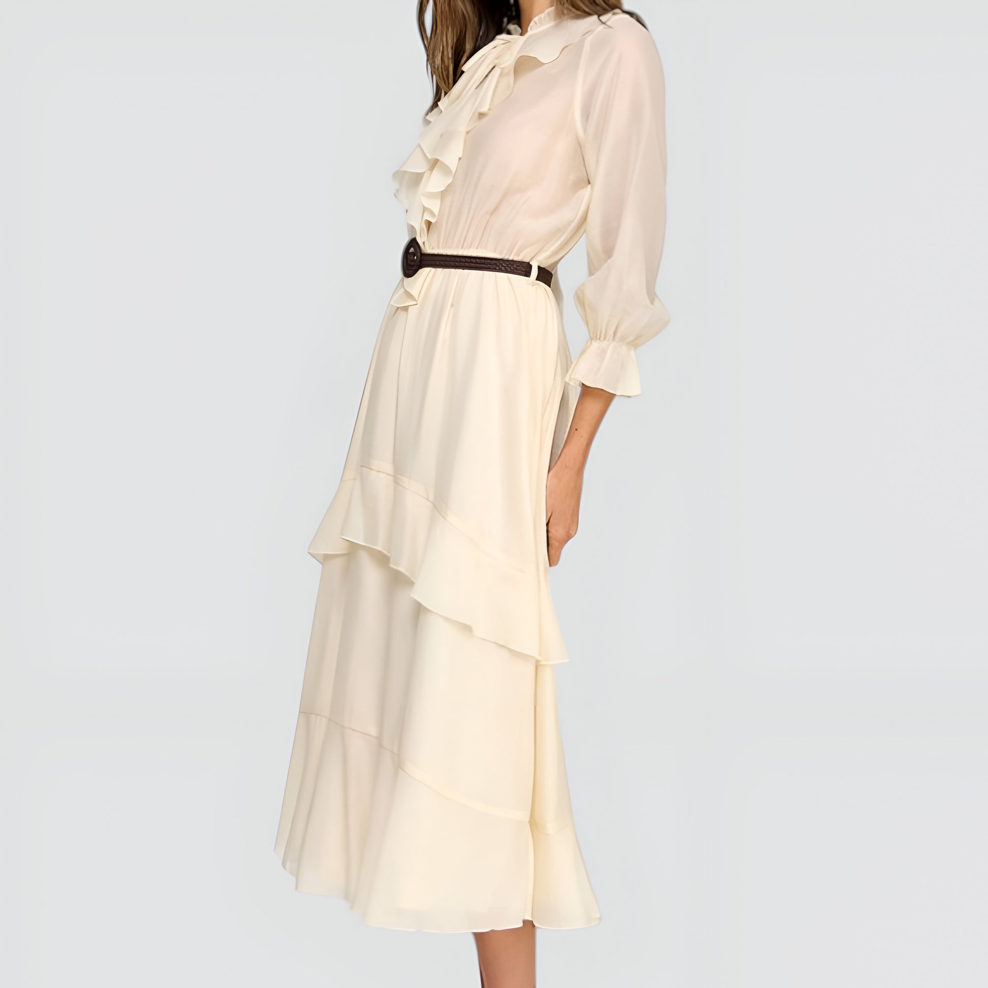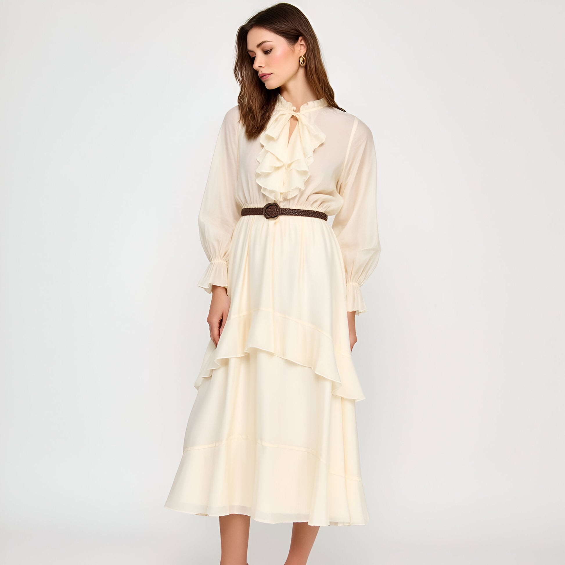 This long sleeve midi dress features a dramatic ruffle front and a soft, tiered skirt for timeless elegance. The high neckline is adorned with a delicate tie, while the cinched belted waist creates a flattering silhouette. Crafted from lightweight, flowy fabric, this dress moves beautifully and feels comfortable all day. Perfect for adding romance and sophistication to any wardrobe, this style transitions effortlessly from day to evening.