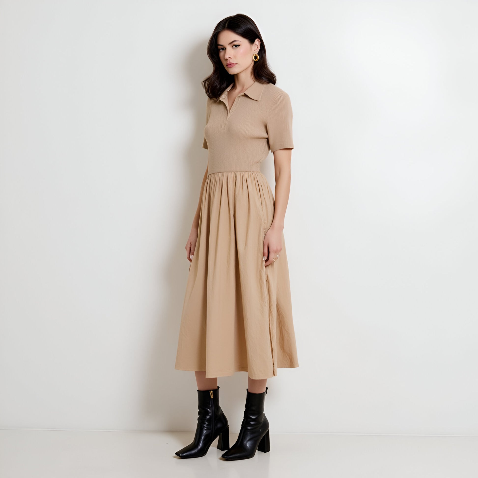 A chic fusion of classic and modern, this midi dress features a soft sweater-knit bodice with a polished polo collar and short sleeves, seamlessly transitioning into a gathered, lightweight woven skirt. The fitted top and flared skirt create a flattering silhouette, making this dress ideal for versatile styling from desk to dinner. The midi length offers elegant coverage, while the textured contrast between the top and skirt adds visual interest and depth. Pair with sleek ankle boots or delicate flats for an effortlessly refined look.
