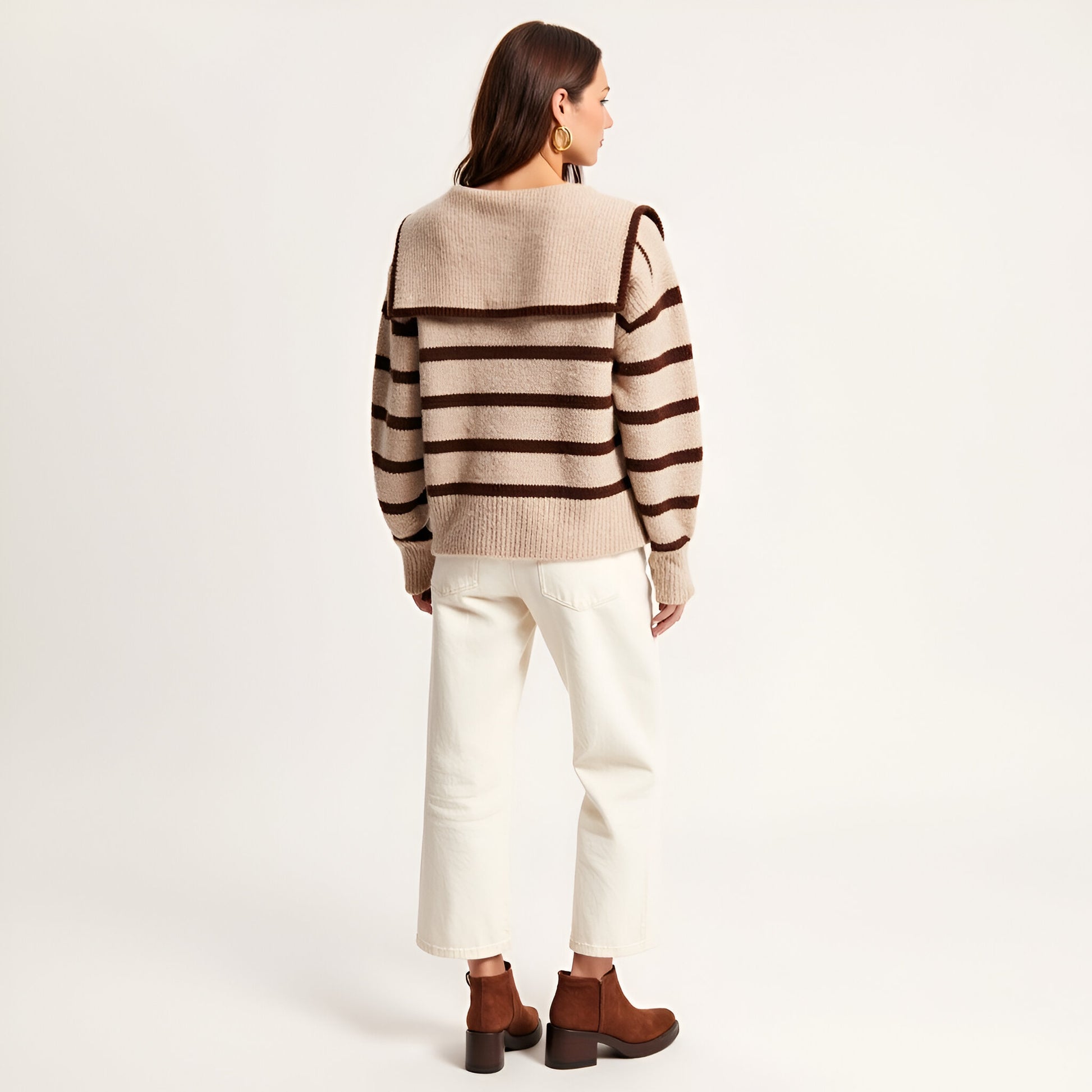 This cozy striped crewneck sweater features a wide sailor-inspired collar with an adjustable front tie for a playful yet polished touch. The soft, medium-weight knit is finished with dropped shoulders and ribbed cuffs, adding extra comfort and relaxed structure. Perfect for pairing with everything from denim to wide-leg trousers, this top blends classic nautical vibes with modern femininity. Layer it over a crisp shirt or wear solo for a chic everyday look.
