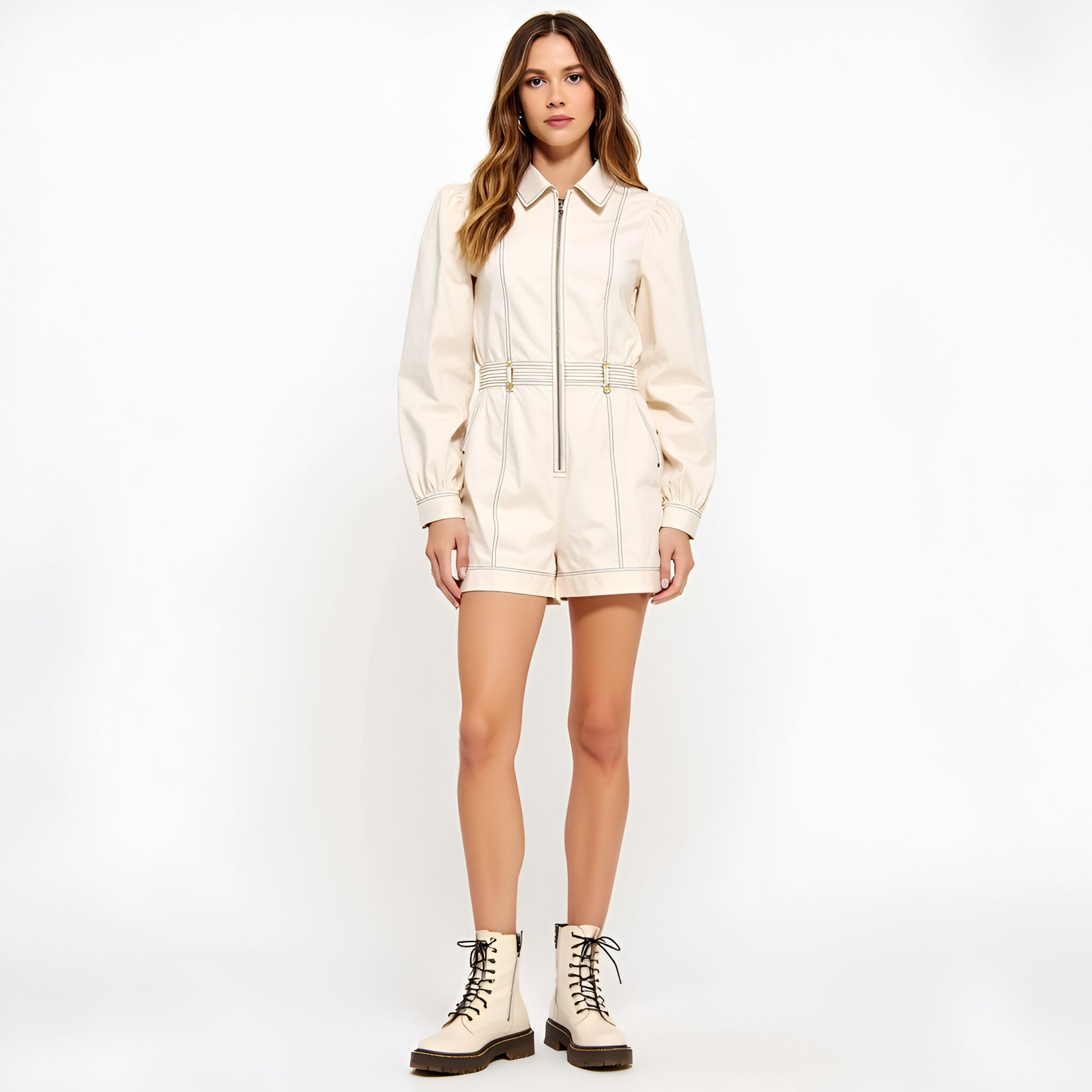 Effortlessly chic and modern, this long sleeve romper features crisp contrast topstitching and a sleek zip front closure. The structured silhouette is balanced by a defined waist and subtle puff sleeves, offering a tailored yet relaxed fit. Finished with side pockets for functional appeal, this piece transitions seamlessly from daytime errands to weekend outings. Dress it up with heels or keep it casual with sneakers.