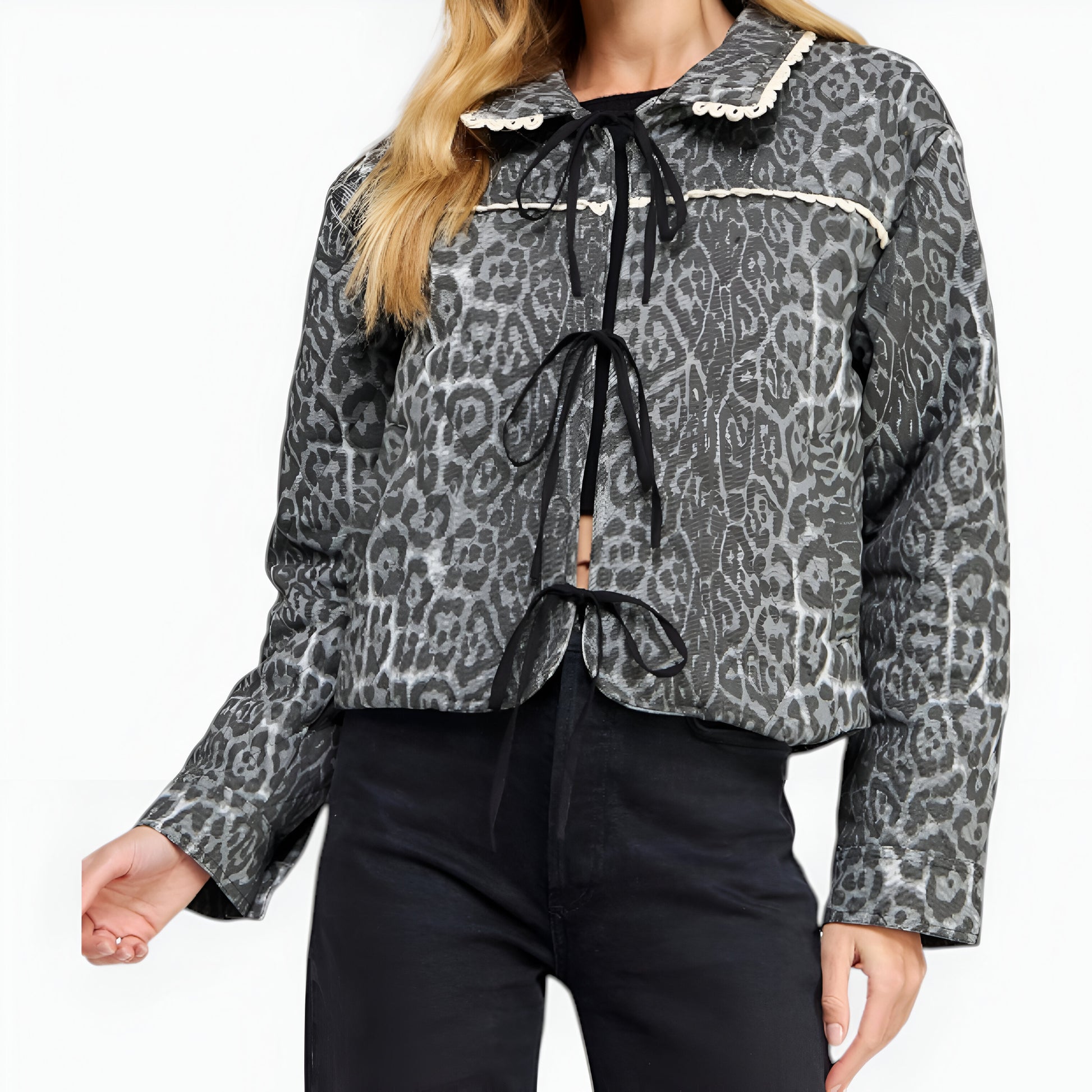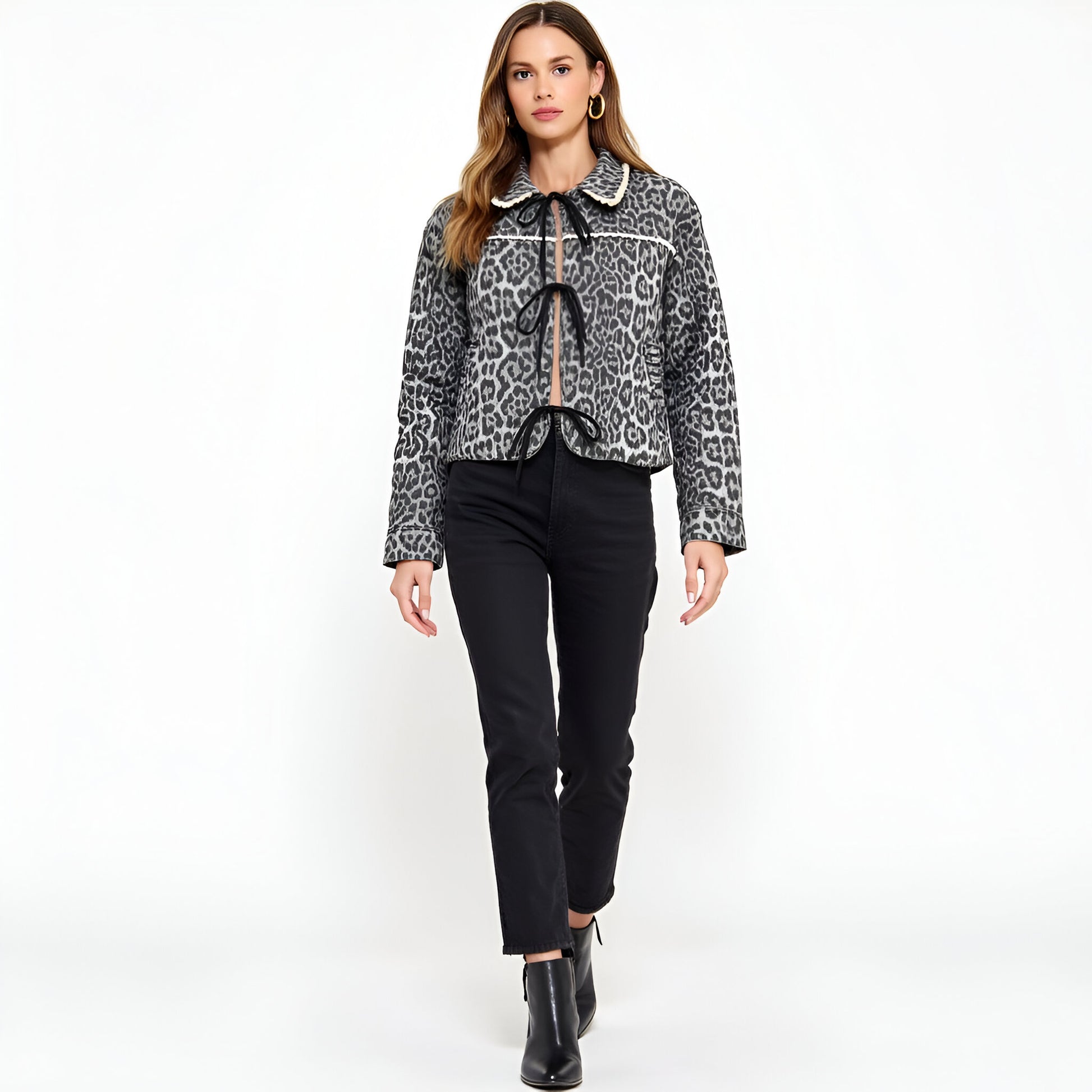 This statement cropped jacket showcases a tonal leopard jacquard pattern, finished with a feminine scalloped collar and three dainty bow tie closures down the front. Lightly structured, it features a relaxed fit and subtle piping details for extra polish. Pair it with denim or sleek trousers to add a playful yet sophisticated edge to your wardrobe. The perfect piece for transitional layering and bold everyday looks.
