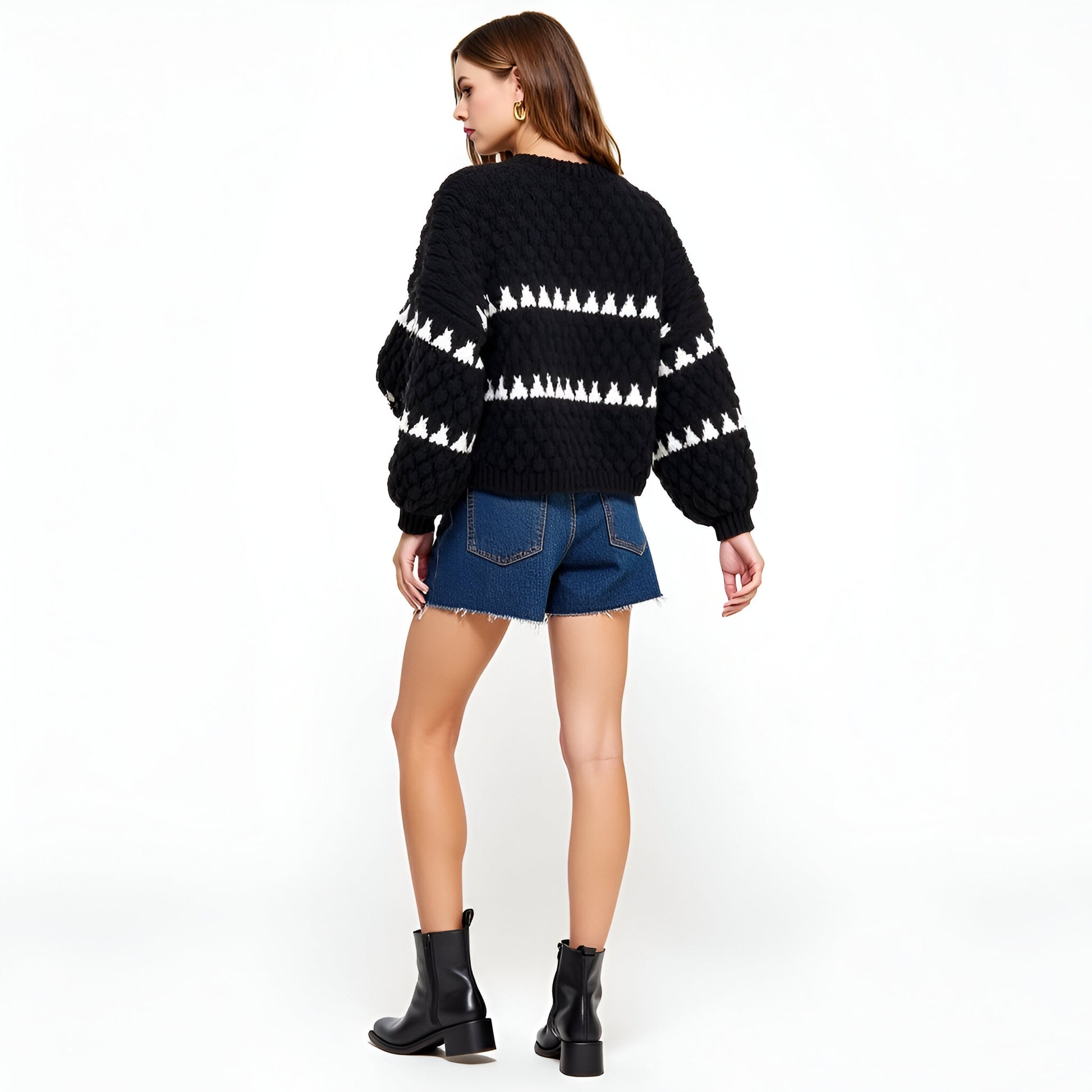 Chunky Jacquard Stripe Sweater with Bubble Sleeves and Crewneck Detail