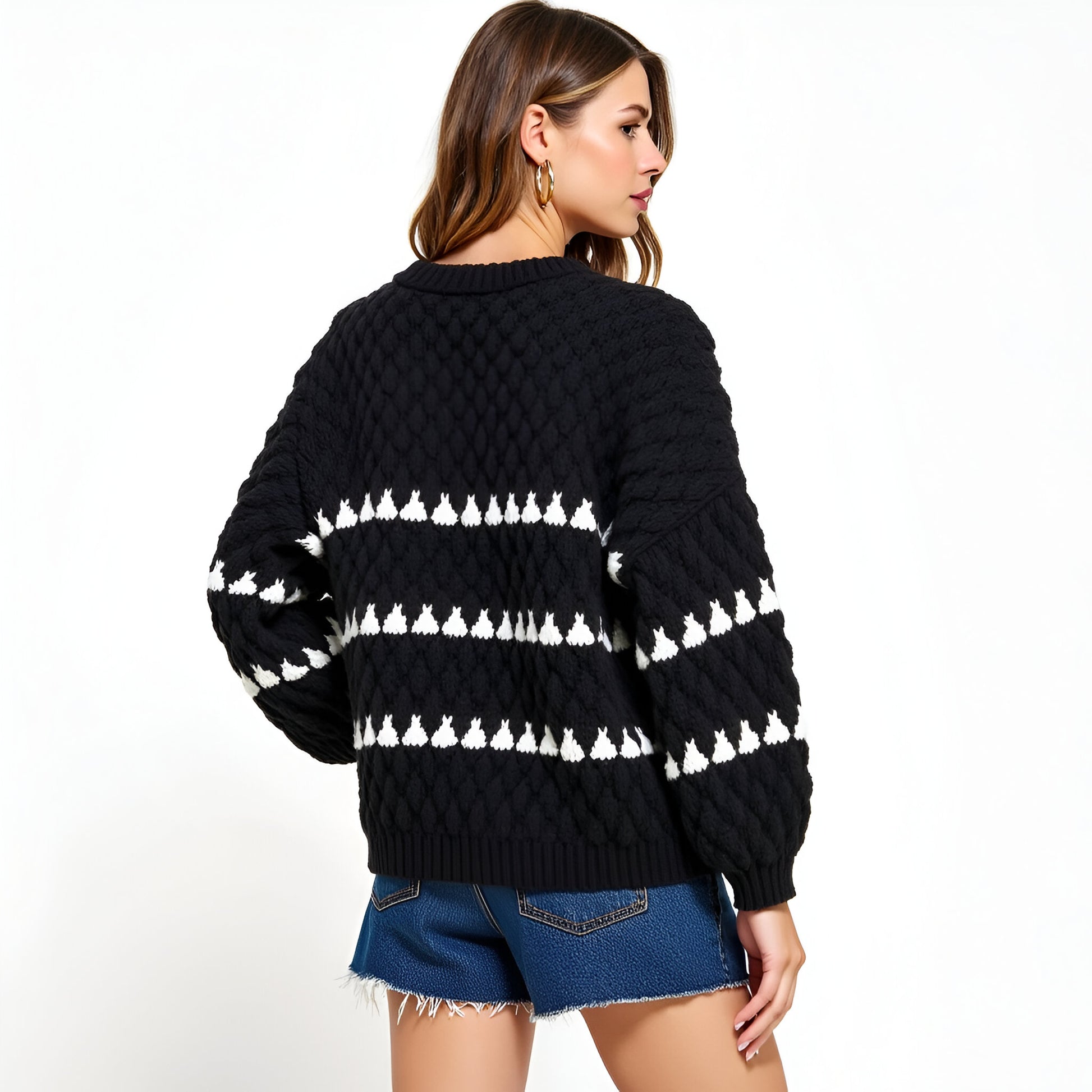 This cozy sweater features a chunky jacquard knit with bold geometric stripes for standout style. The classic crew neckline is balanced by voluminous bubble sleeves, creating a relaxed yet refined silhouette. Ribbed cuffs and hem keep the look polished and comfortable. Layer it over jeans, trousers, or skirts for a playful, elevated approach to everyday dressing.