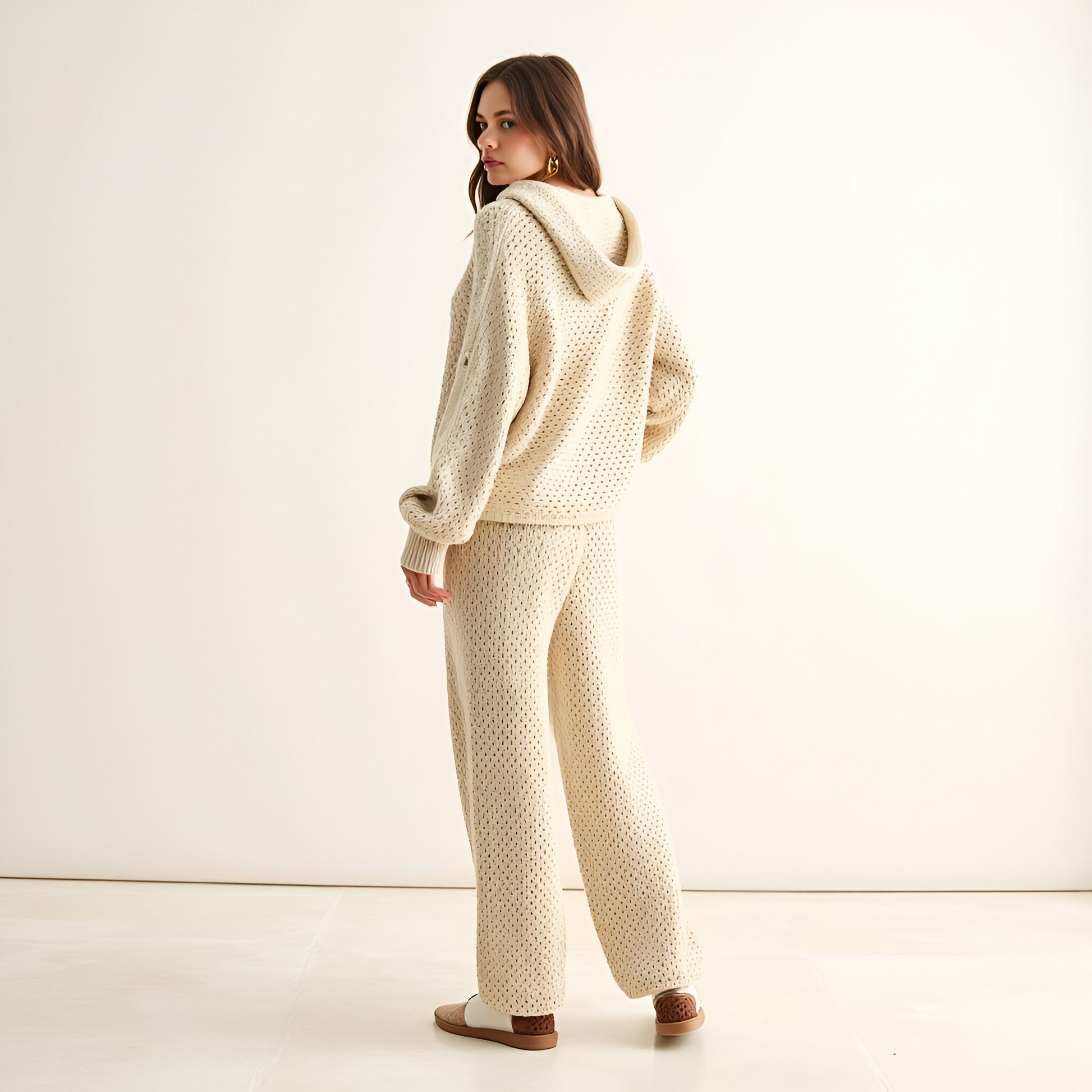 This crochet knit hoodie features a soft, open-stitch texture and a casual, relaxed silhouette. The design is finished with a classic henley button front and a generous hood for cozy appeal. Ribbed cuffs and hem add gentle structure, making it easy to style over your favorite basics. Effortlessly modern, this piece transitions from lounging at home to casual weekends out.