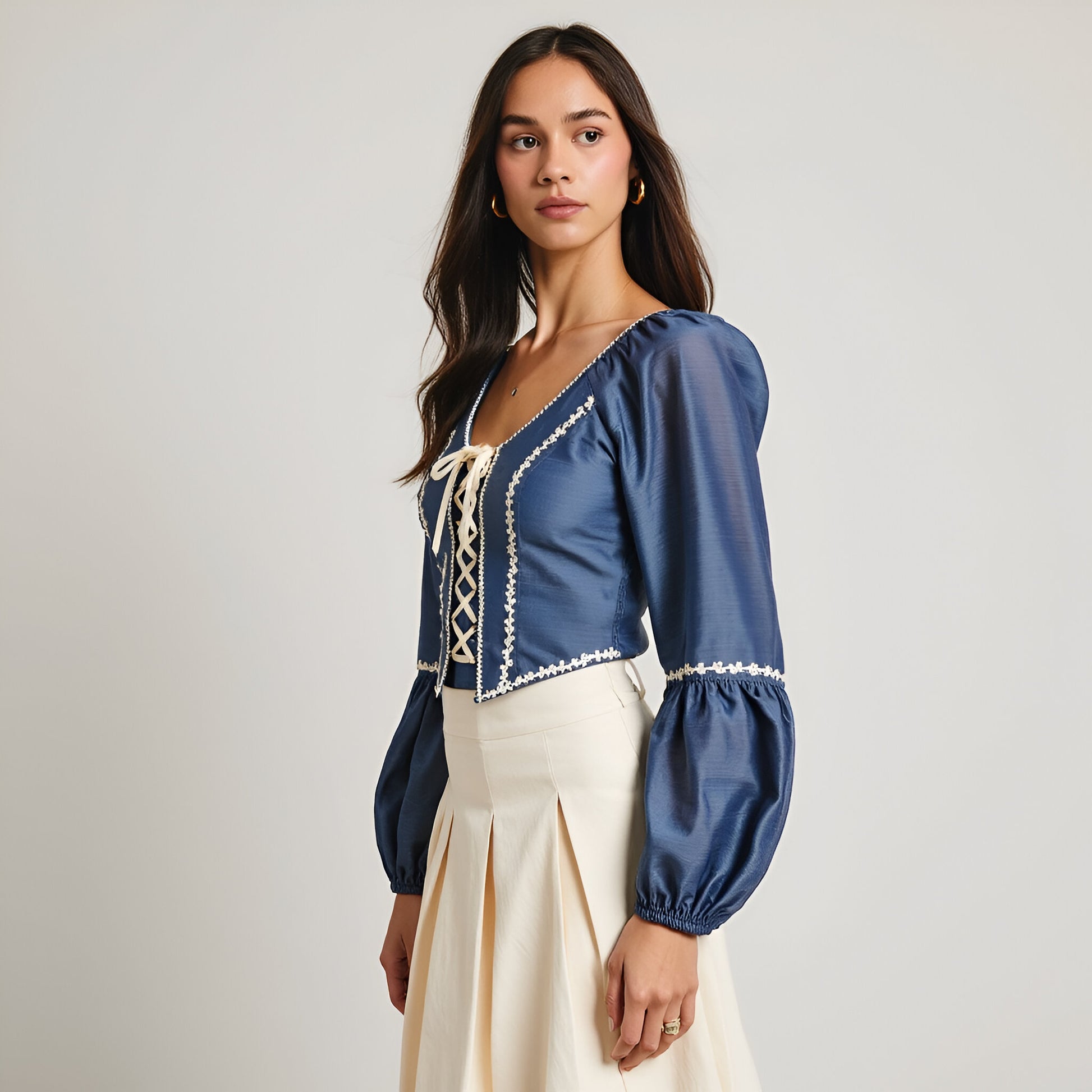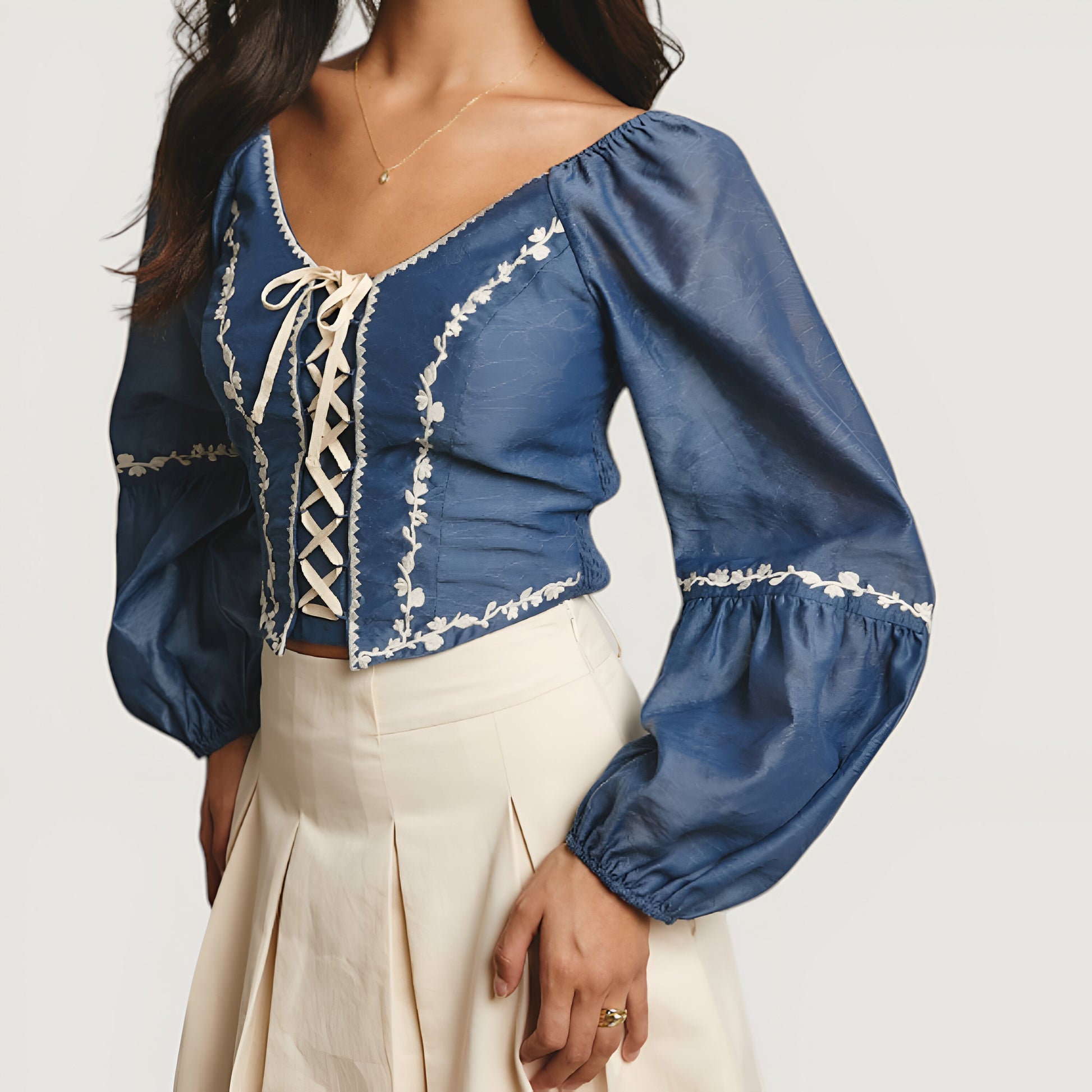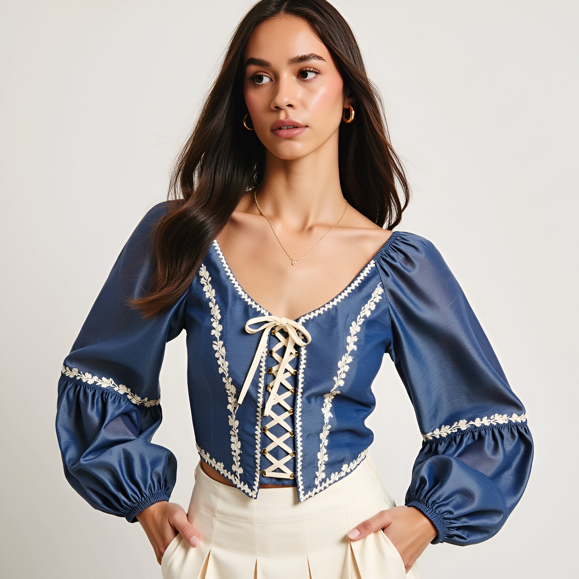 This puff sleeve crop top is a statement piece featuring intricate embroidered floral trim along the neckline, sleeves, and bodice. The lace-up front detail adds a touch of vintage-inspired charm, while the elastic cuffs enhance comfort and create a voluminous sleeve shape. Crafted from a smooth, lightweight fabric, it offers a flattering, structured fit that pairs beautifully with skirts or high-waisted pants.
