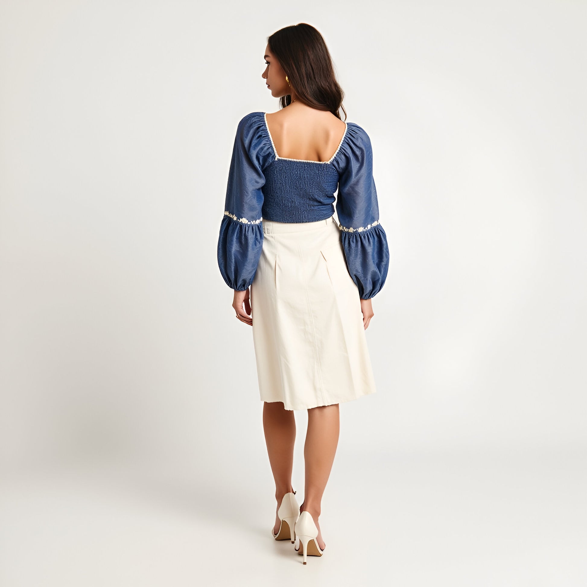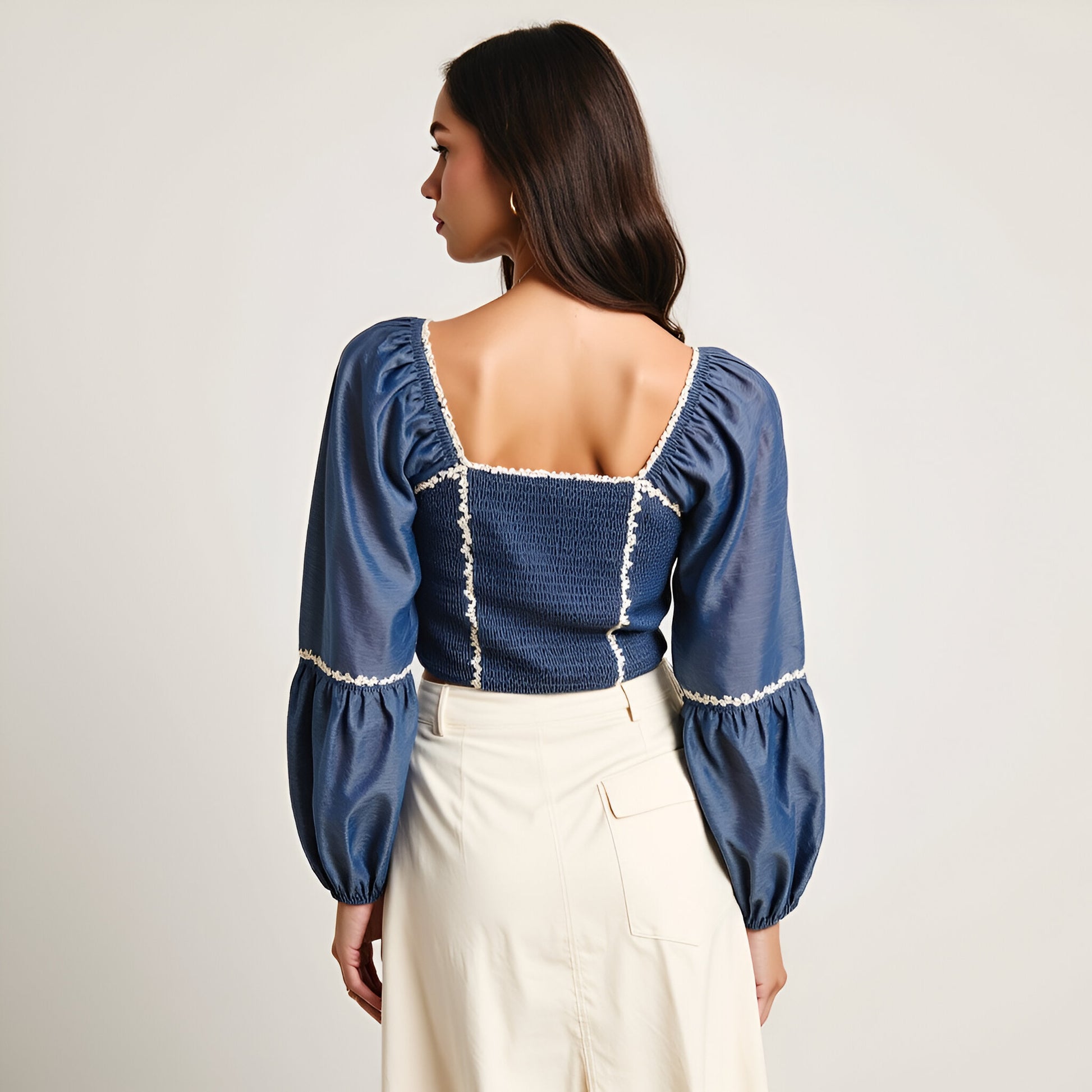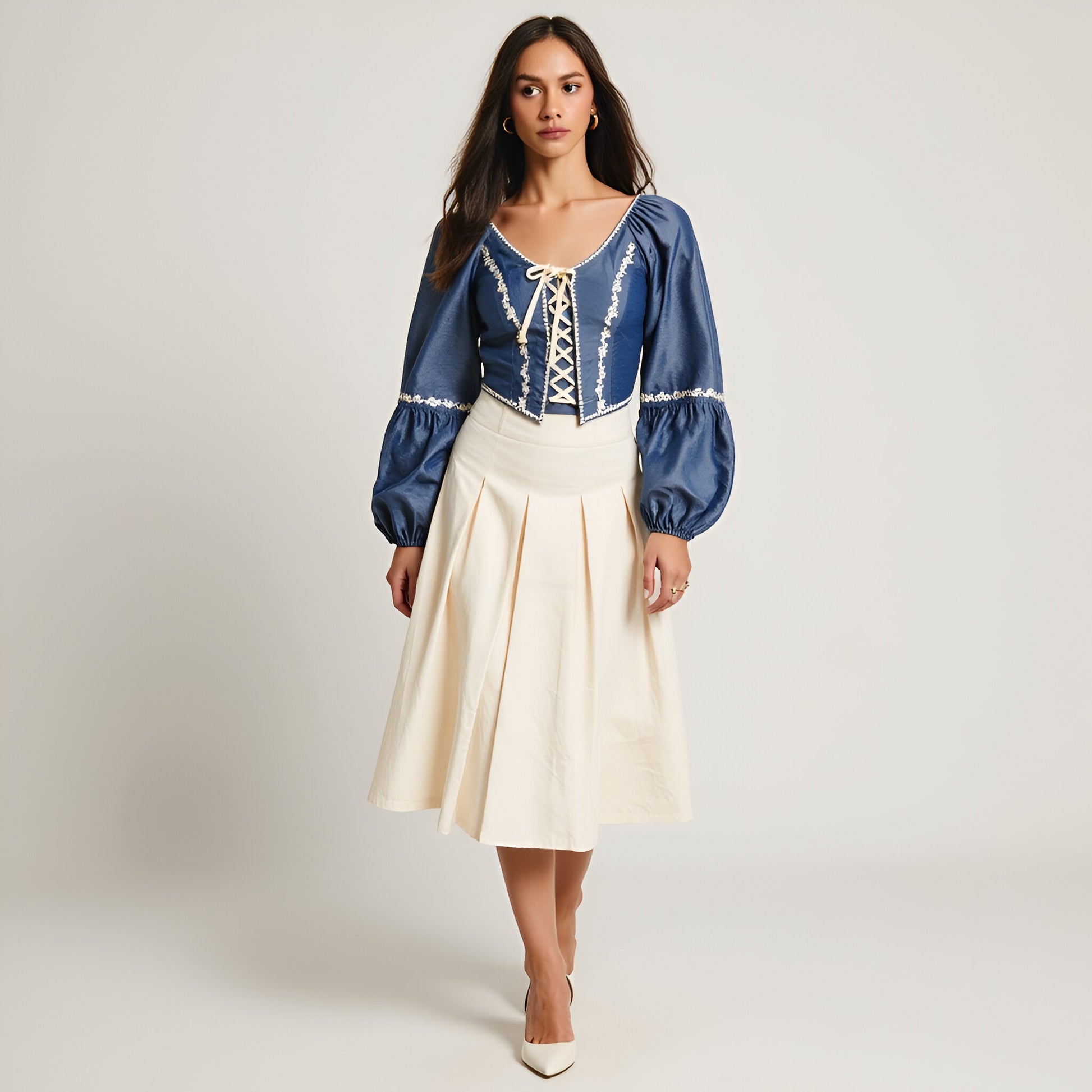 This puff sleeve crop top is a statement piece featuring intricate embroidered floral trim along the neckline, sleeves, and bodice. The lace-up front detail adds a touch of vintage-inspired charm, while the elastic cuffs enhance comfort and create a voluminous sleeve shape. Crafted from a smooth, lightweight fabric, it offers a flattering, structured fit that pairs beautifully with skirts or high-waisted pants.