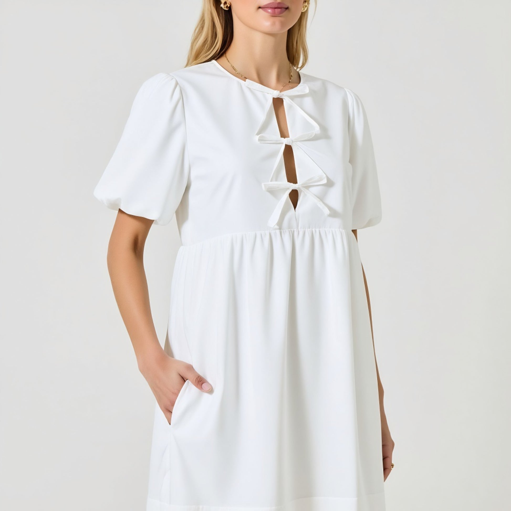 Effortlessly chic and playful, this puff sleeve mini dress features a tiered keyhole neckline adorned with dainty bow ties for a flirty twist. The gathered empire waistline flatters the silhouette while the voluminous short sleeves and mini length keep the look light and feminine. Side pockets add a practical touch, making this dress ideal for daytime outings, brunches, or casual get-togethers.