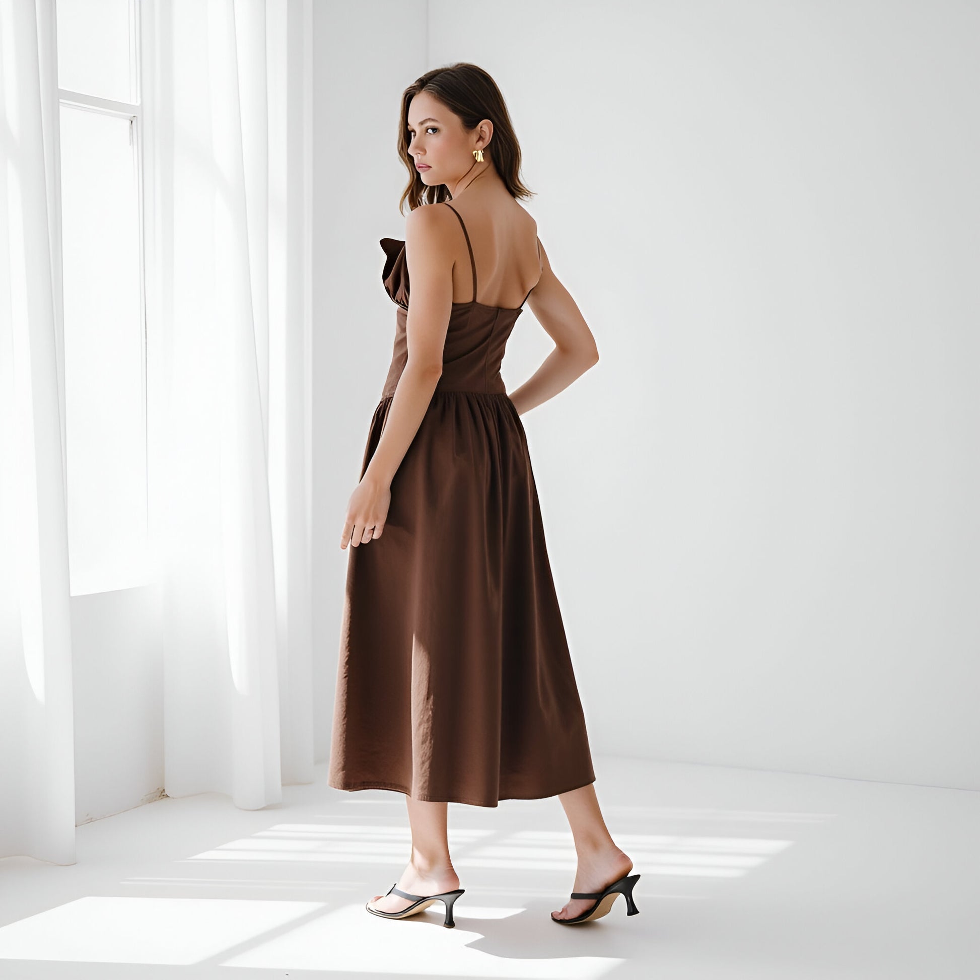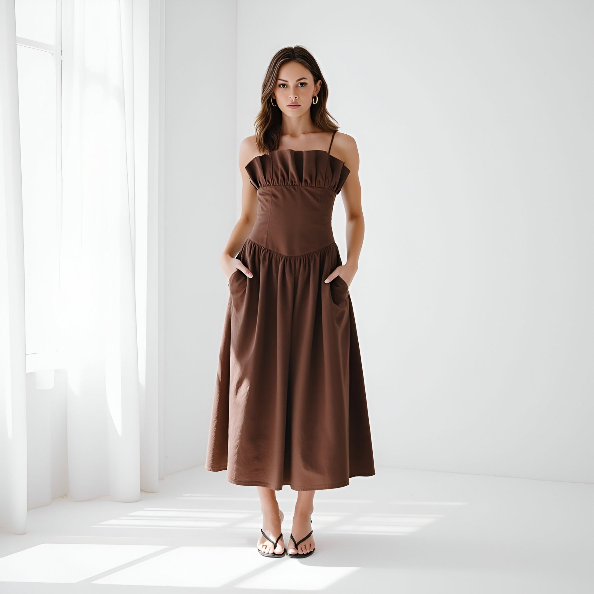 This midi dress features a softly structured bodice and delicate spaghetti straps for an elegant, feminine look. The neckline is adorned with dramatic ruffle trim, adding movement and a touch of romance. A full, gathered skirt with discreet side pockets offers comfort and versatility. Pair it with sandals or heels for a polished ensemble that transitions seamlessly from day to night.