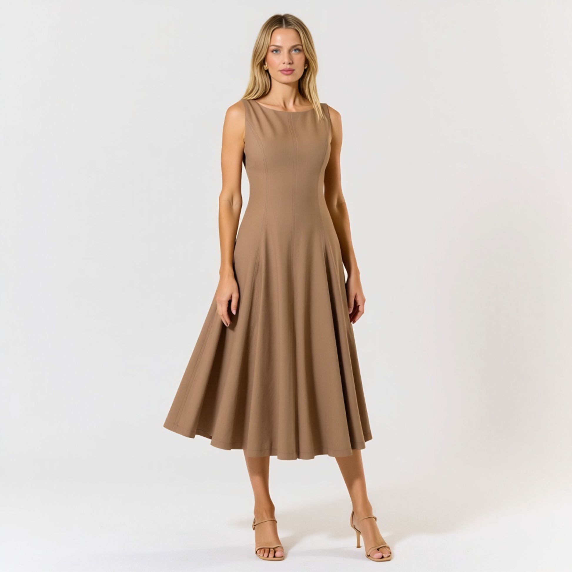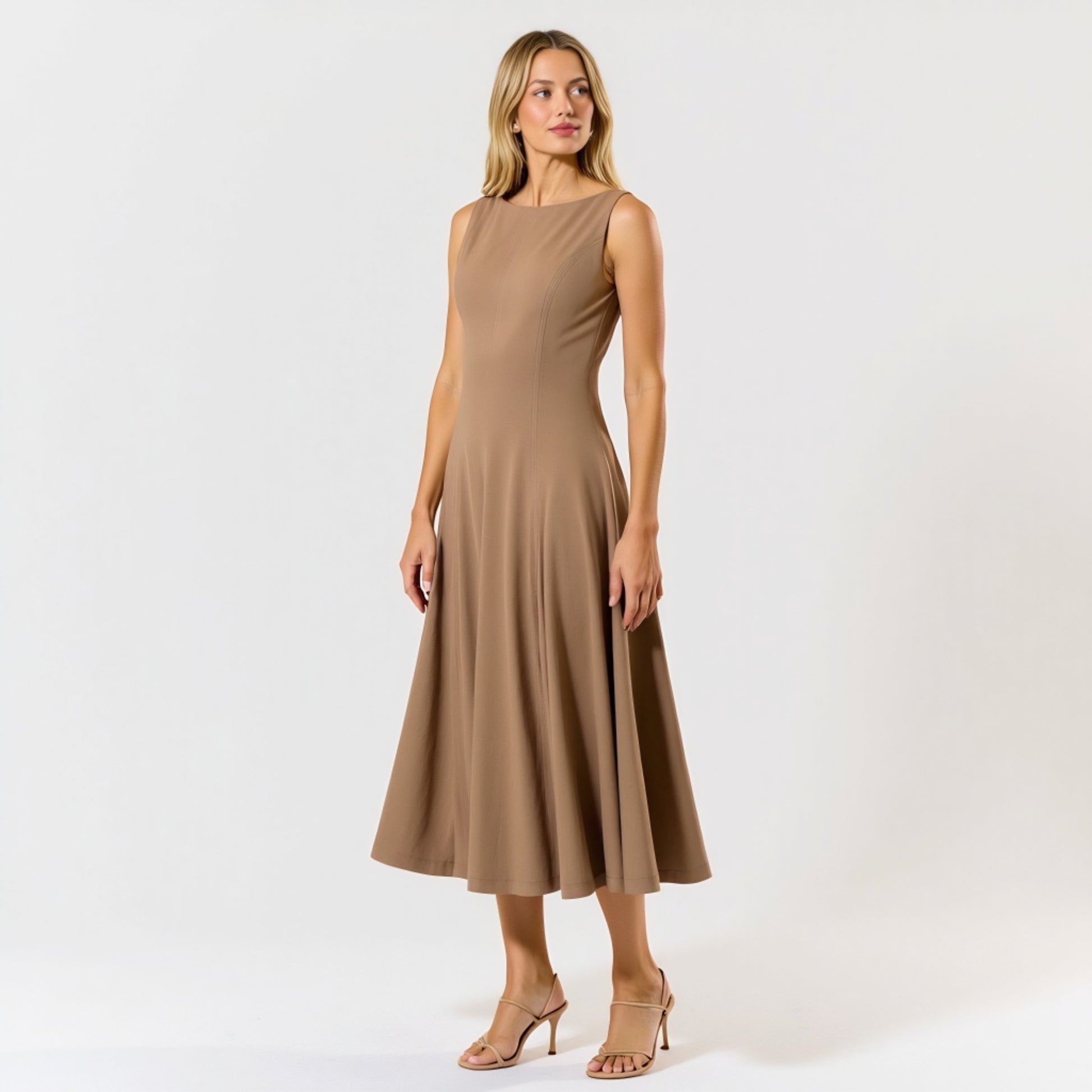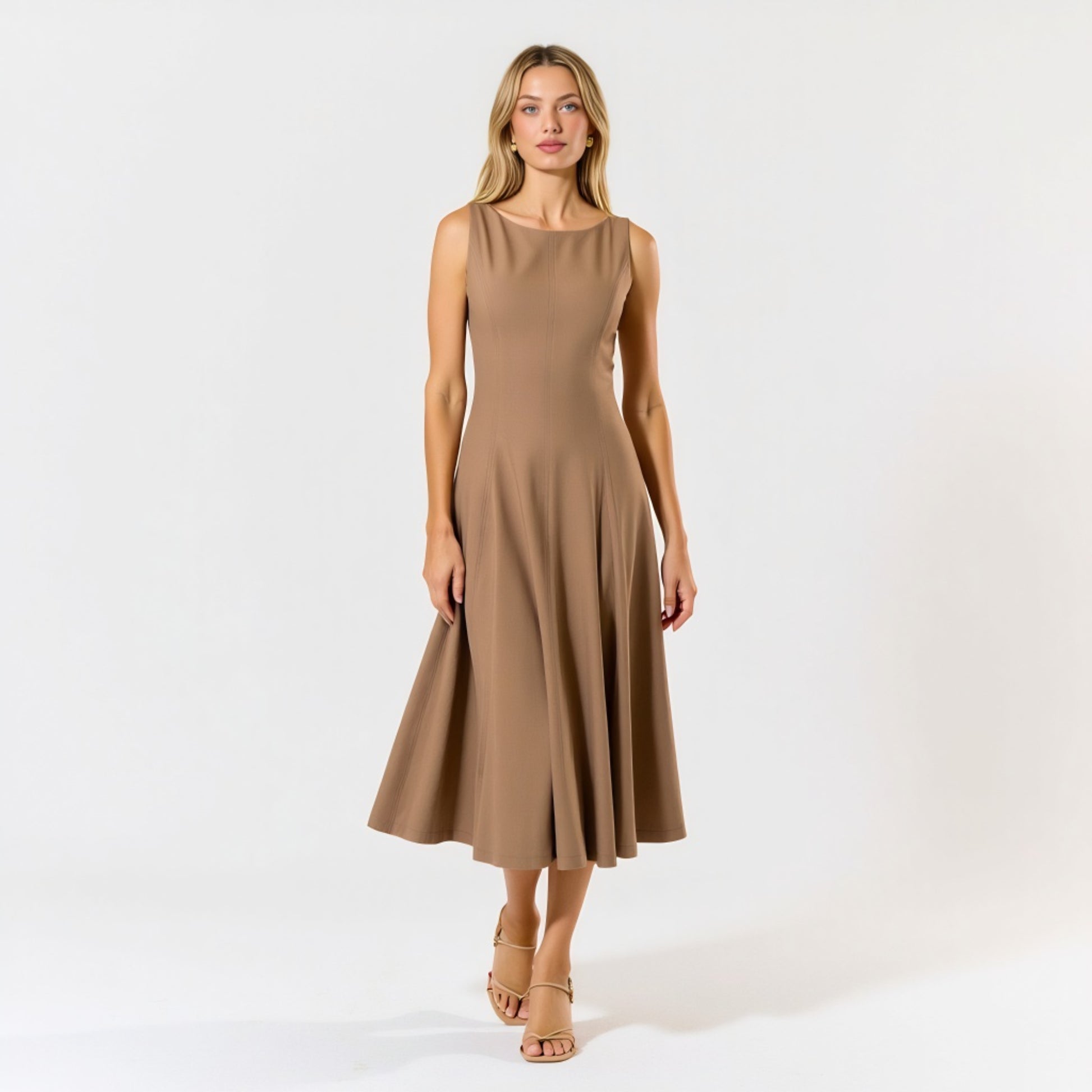 Elevate your wardrobe with this sleeveless midi dress featuring a refined boat neckline and sculpted seam detailing for a tailored fit. The bodice hugs your figure before flowing into a full A-line skirt that moves beautifully with every step. Designed in a soft, structured fabric, this dress combines comfort with polished sophistication. Perfect for workdays, special occasions, or weekend outings—simply switch out accessories for an instant style refresh.