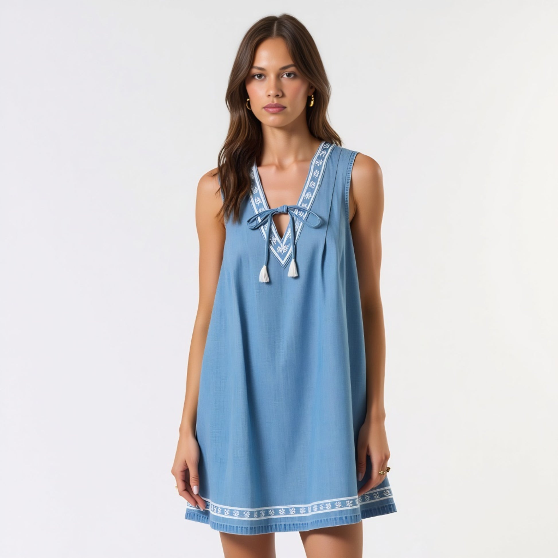 This sleeveless mini dress features charming embroidered trim along the neckline and hem, adding a delicate touch to the breezy silhouette. The V-neckline is accented by a self-tie with tassel ends for an effortlessly boho finish. Designed for warm weather and easy movement, the relaxed fit offers all-day comfort while maintaining a polished look. Whether paired with sandals or wedges, this dress is perfect for weekend getaways, outdoor brunches, or laid-back days in the sun.