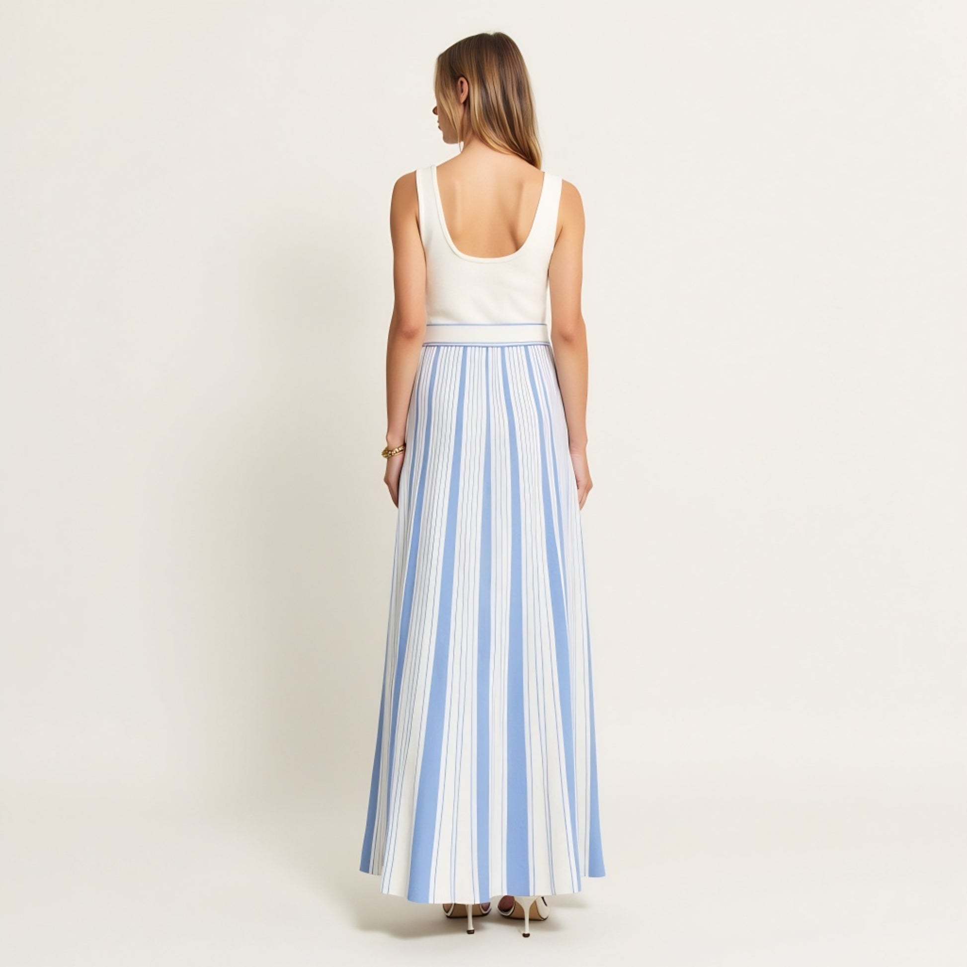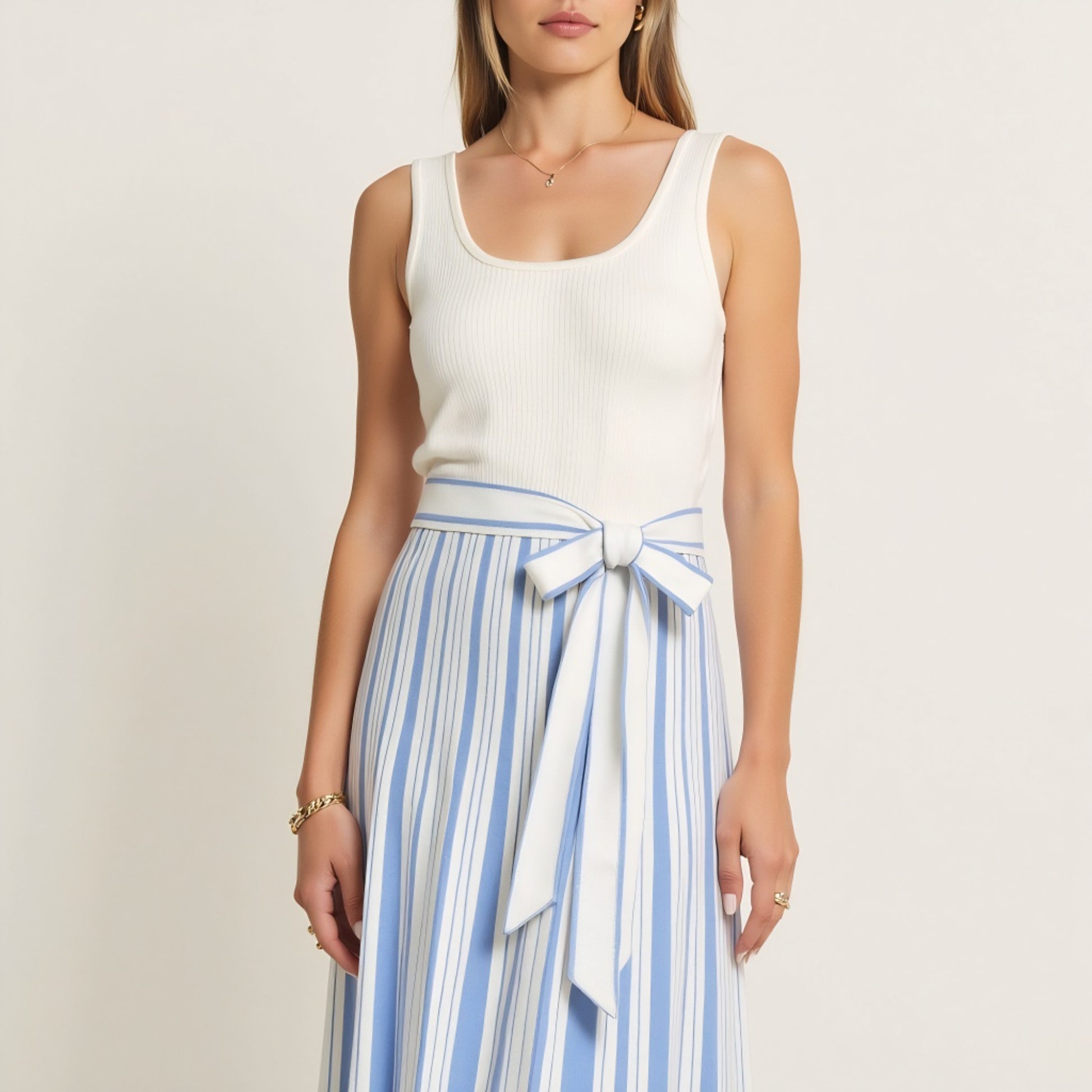 This sleeveless maxi dress combines modern ease with classic elegance, featuring a fitted scoop neck bodice and a flowy striped skirt. The high-waist silhouette is accentuated by a wide self-tie sash that defines your shape while adding a soft, feminine touch. Perfect for warm-weather occasions, this piece delivers effortless style whether you’re headed to a garden party or coastal getaway.