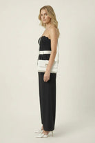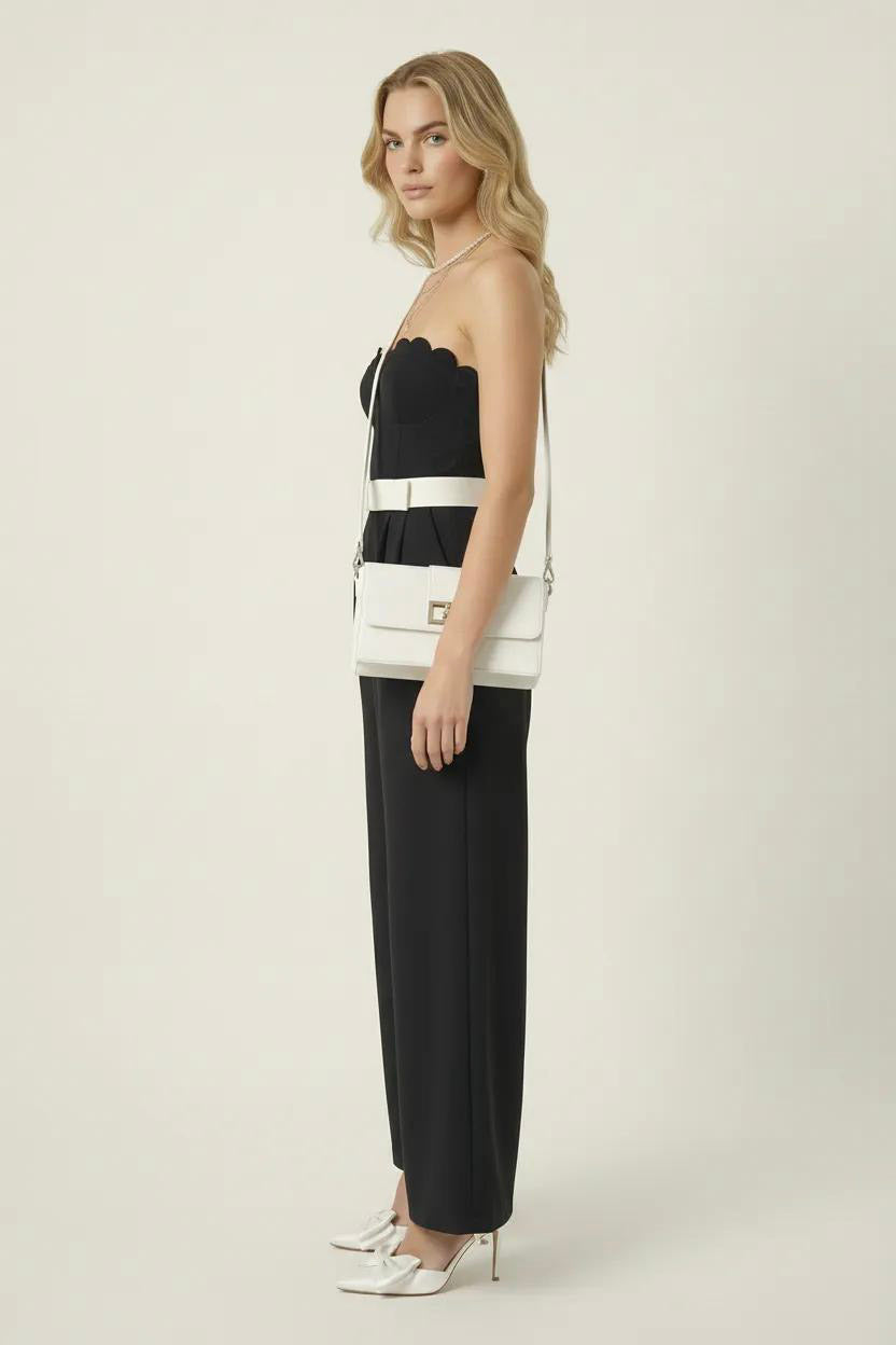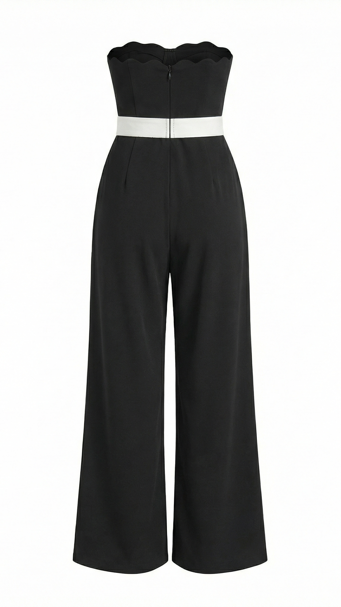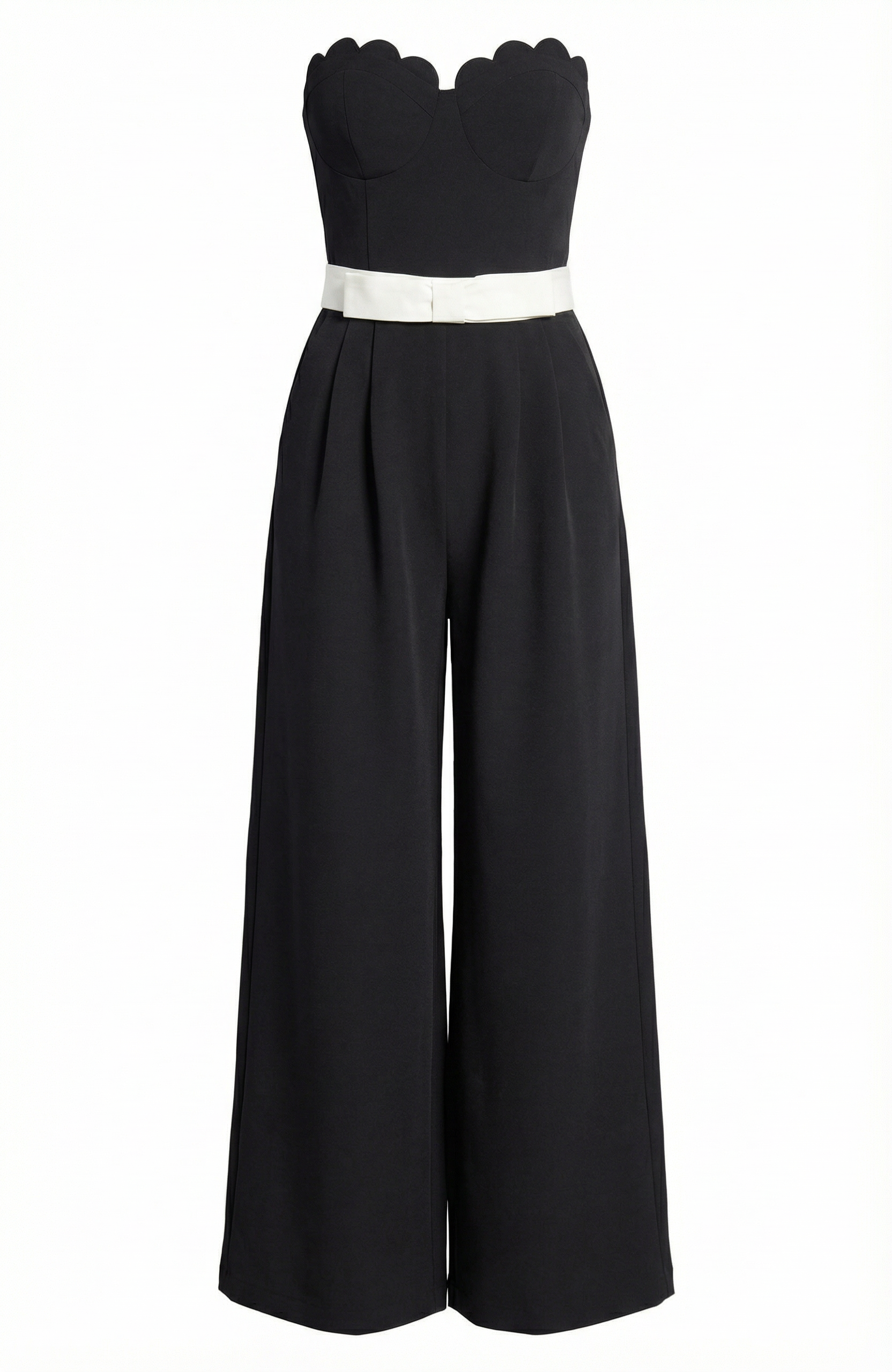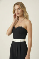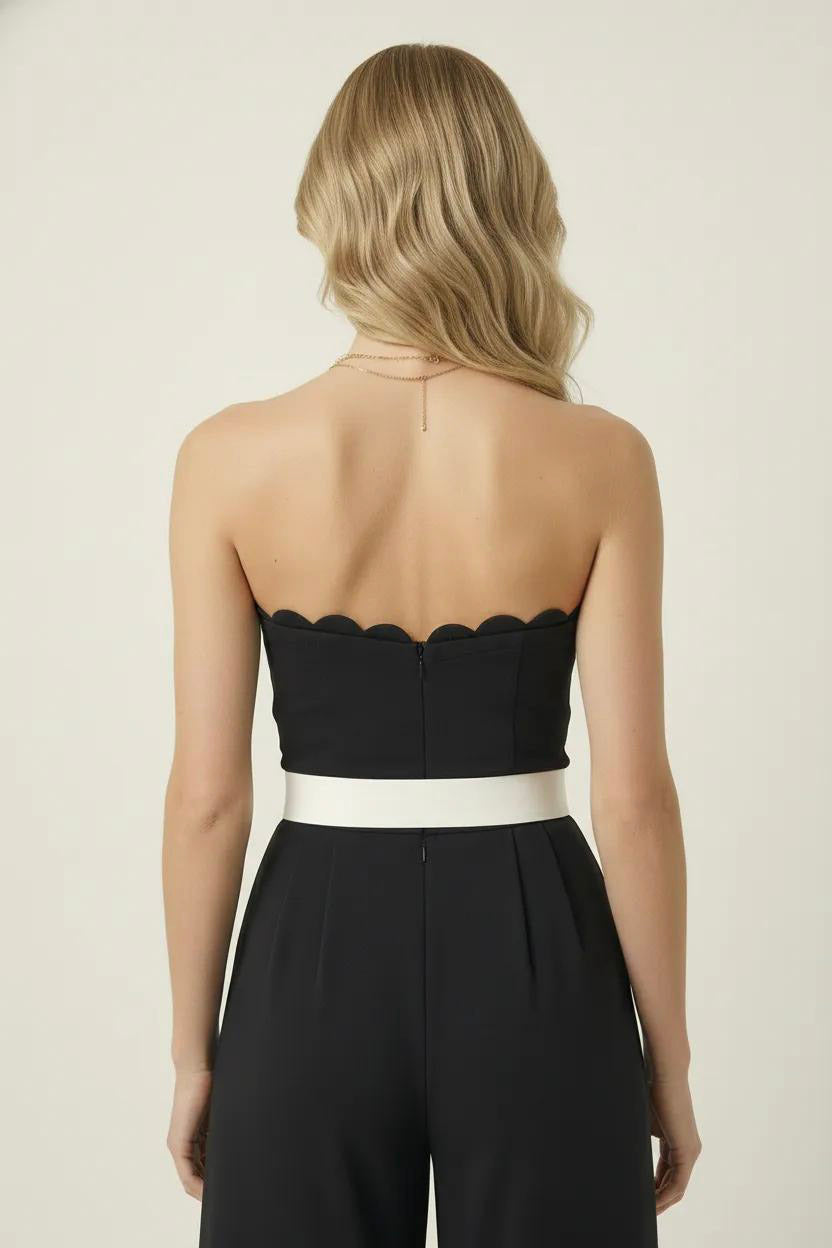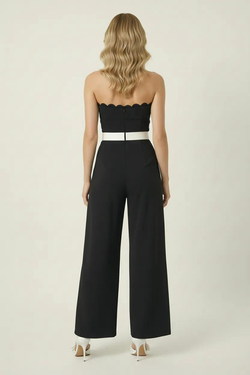 This strapless jumpsuit features an elegant scalloped bodice that adds a romantic touch to its sleek silhouette. The contrast white waist belt cinches the figure, enhancing the tailored fit through the torso. Wide-leg pants flow effortlessly from the fitted waist, offering both sophistication and ease of movement. Perfect for pairing with heels for a refined and modern look.