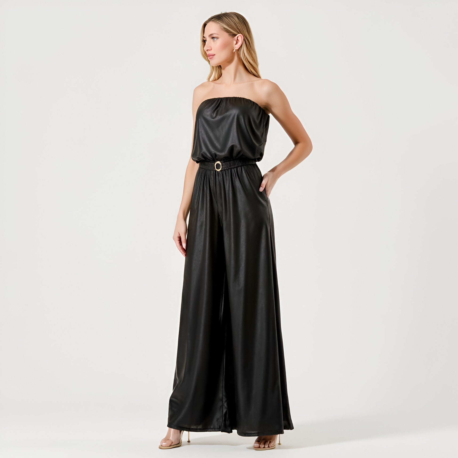 Strapless Satin Jumpsuit with Belted Waist and Wide-Leg Silhouette