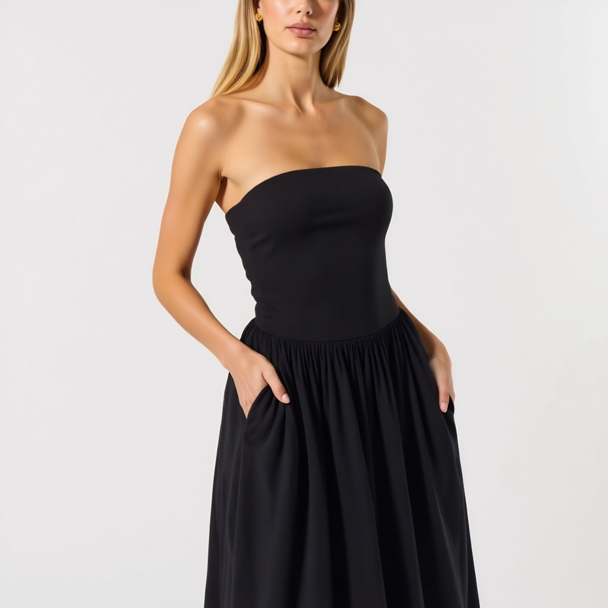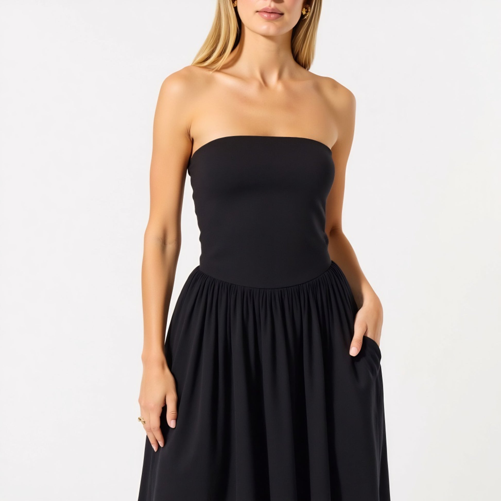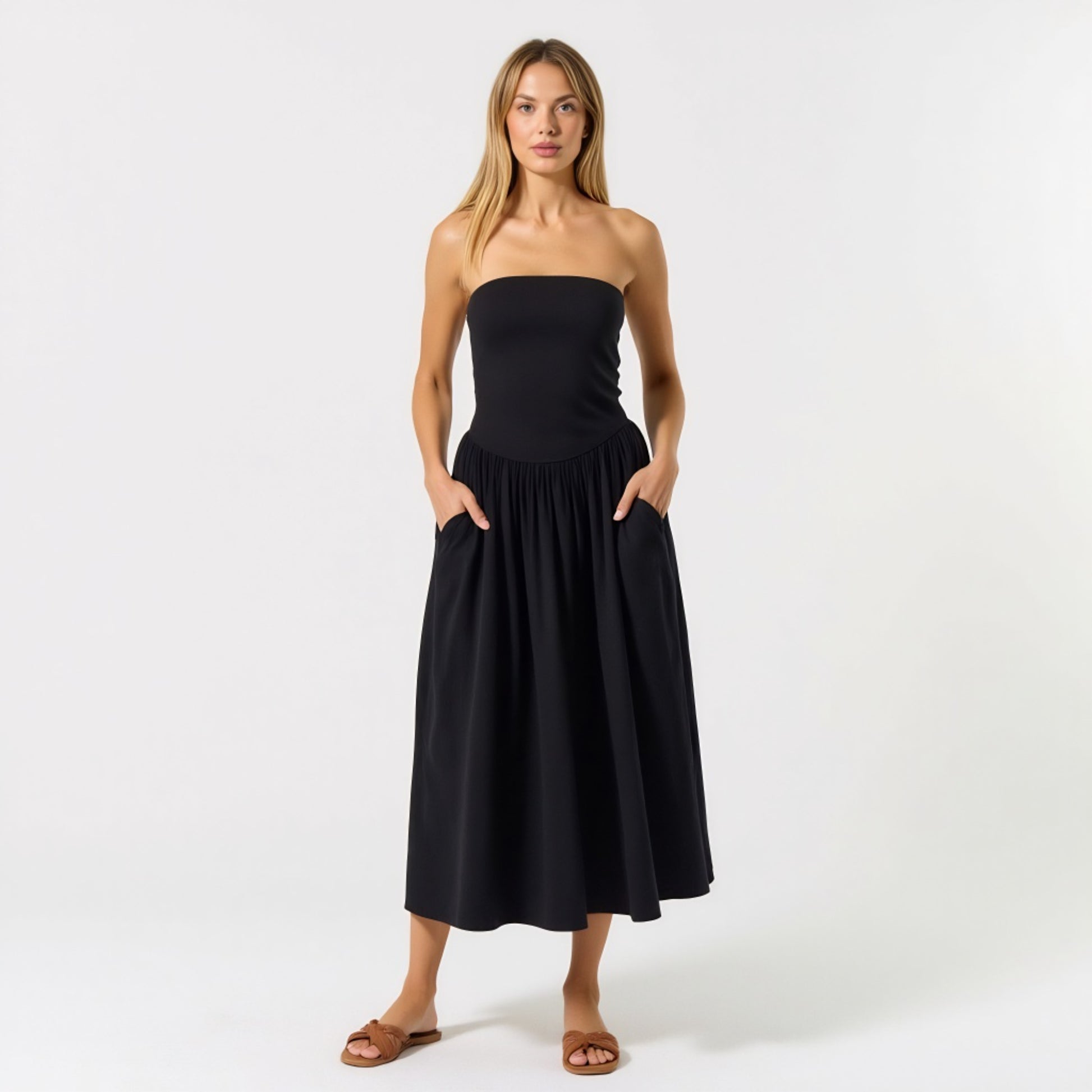 This strapless midi dress blends elegance and ease with a smooth smocked bodice that hugs comfortably and flatters the silhouette. The flowy A-line skirt falls to a graceful midi length, offering a breezy shape perfect for warm-weather wear. Designed with side pockets for functional charm, this dress is a chic choice for both casual outings and dressed-up days. The stretchy, pull-on style adds extra comfort, making it a versatile piece for vacation, brunch, or weekend lounging in style.