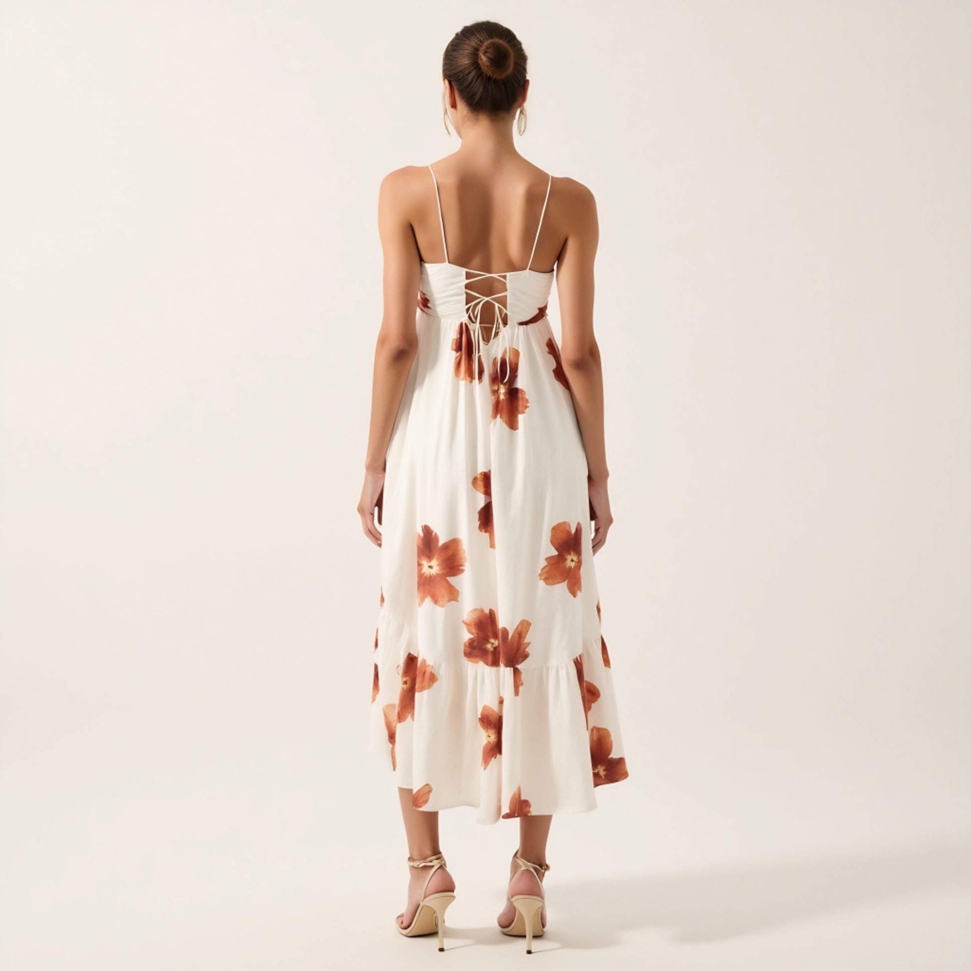 Strappy High Low Dress with Watercolor Floral Print and Smocked Back