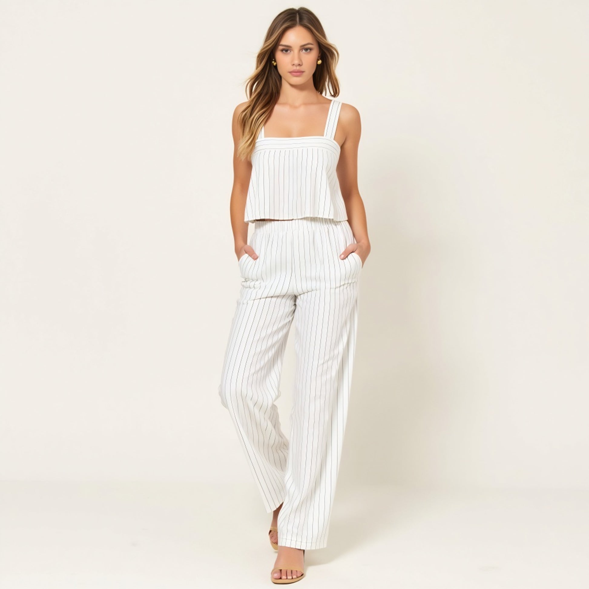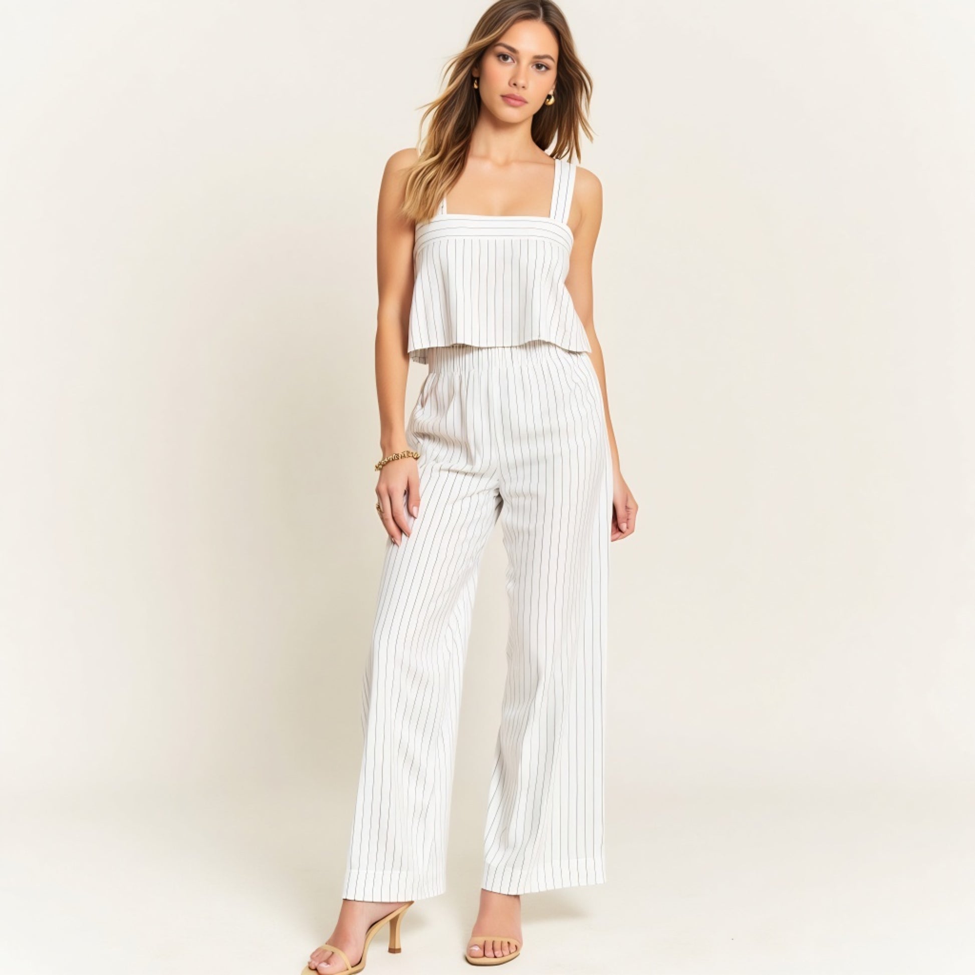 This two-piece set is a breath of fresh air for your wardrobe, featuring a striped crop top with a flounce overlay and chic open back detail. The matching high-rise pants offer a relaxed fit with wide legs that flow effortlessly with every step. Designed for both comfort and elevated style, this set is perfect for brunch dates, summer strolls, or vacation-ready looks. Pair it with heels or slides to complete a polished, easygoing outfit.