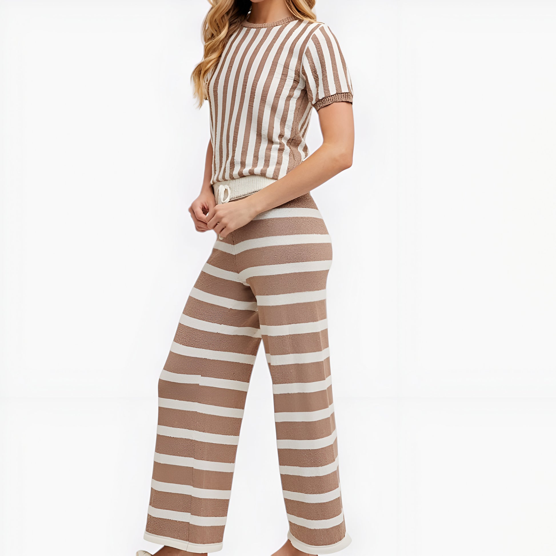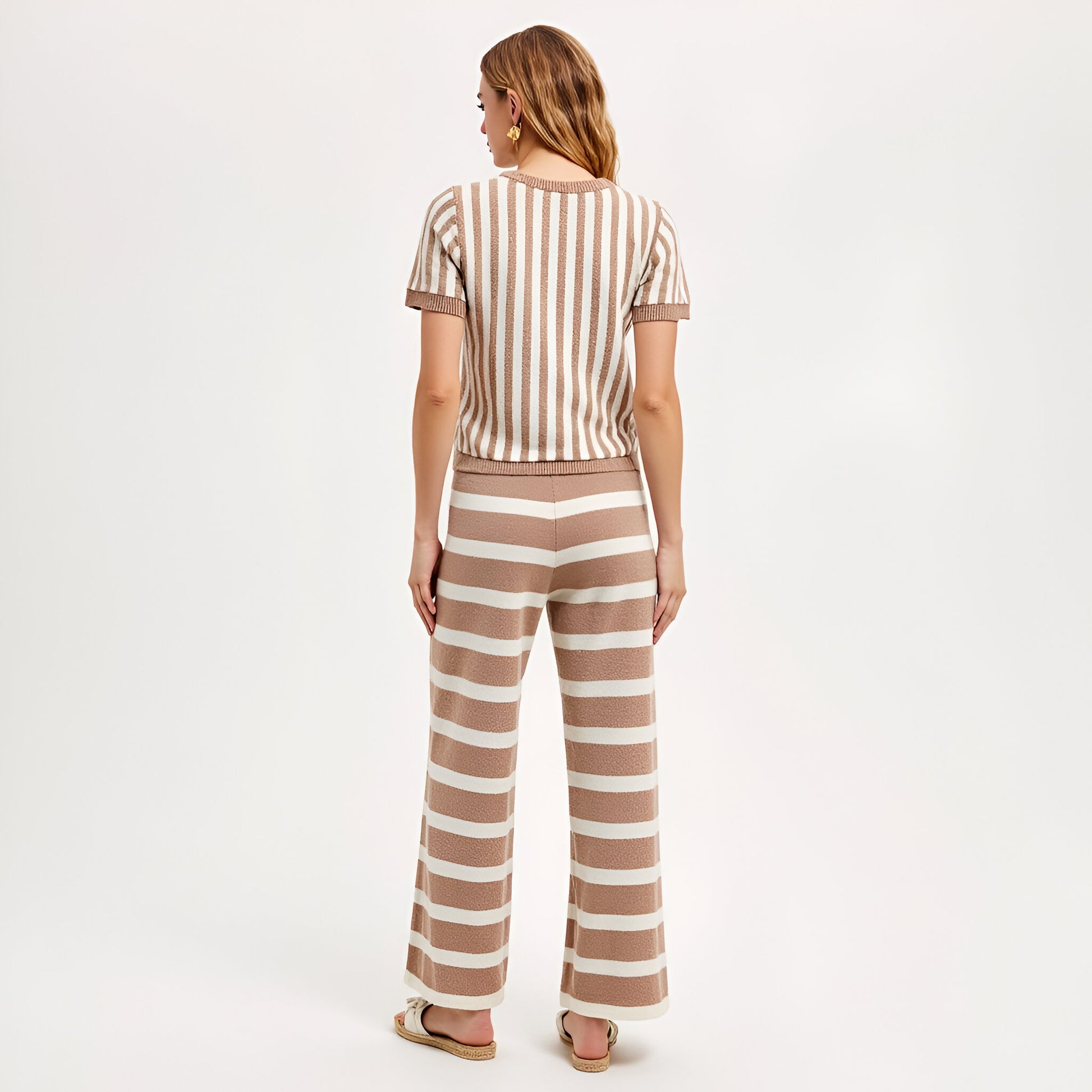 A coordinated lounge set with a playful twist, this duo features a short sleeve crewneck knit top and matching wide leg pants, both in bold two-tone stripes. The pants have a relaxed fit and an adjustable drawstring waist for comfort, making the set perfect for cozy days or casual outings. Soft, stretchy fabric ensures an easy, effortless feel all day. Mix and match each piece for versatile styling options.