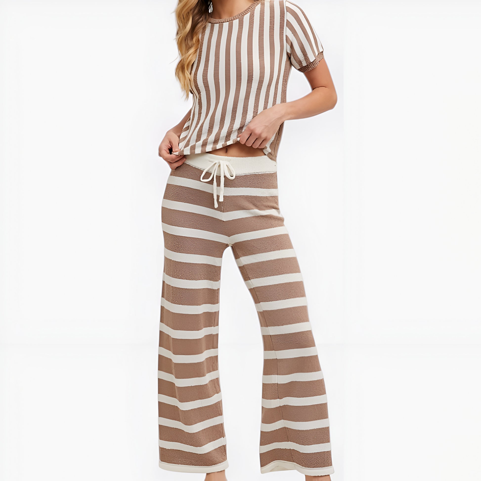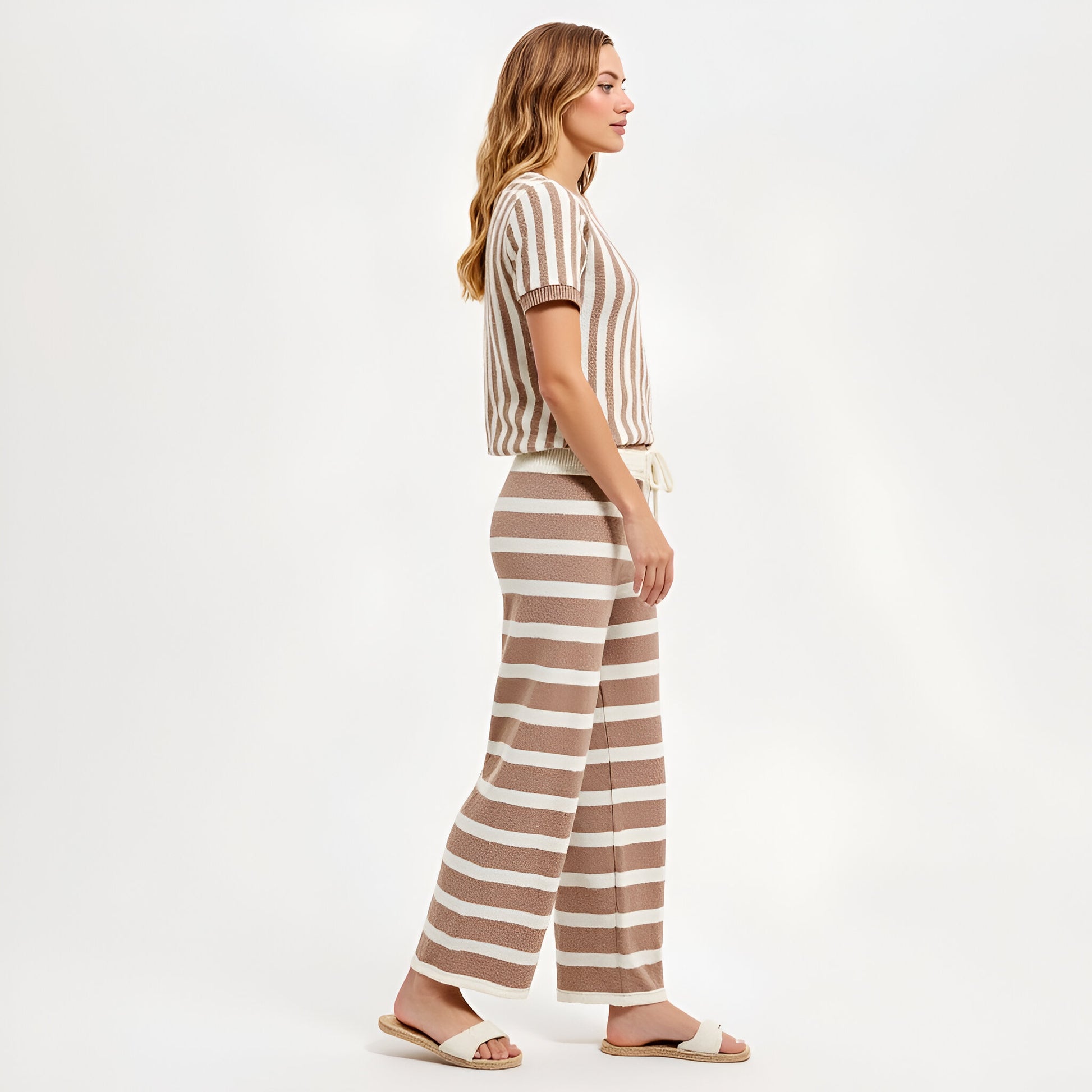Striped Short Sleeve Knit Top and Wide Leg Pants Lounge Set with Drawstring
