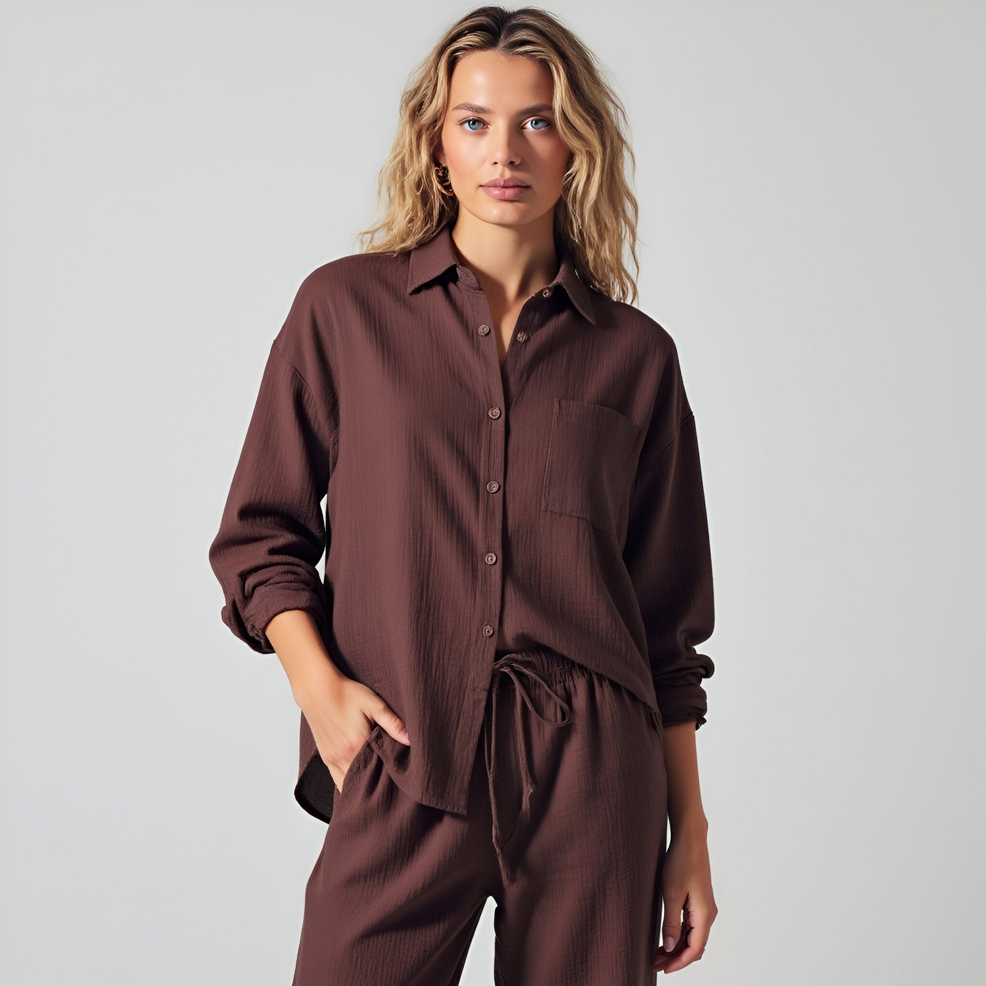 Laid-back yet refined, this textured lounge set features a relaxed button-up shirt with a single chest pocket and softly dropped shoulders. The wide-leg pants have a comfortable elastic waistband with adjustable drawstring and handy side pockets, making them perfect for effortless style at home or on the go. Made from a soft, breathable fabric, this set offers all-day comfort and easy movement. Wear the pieces together for a coordinated look or mix and match with your wardrobe staples.