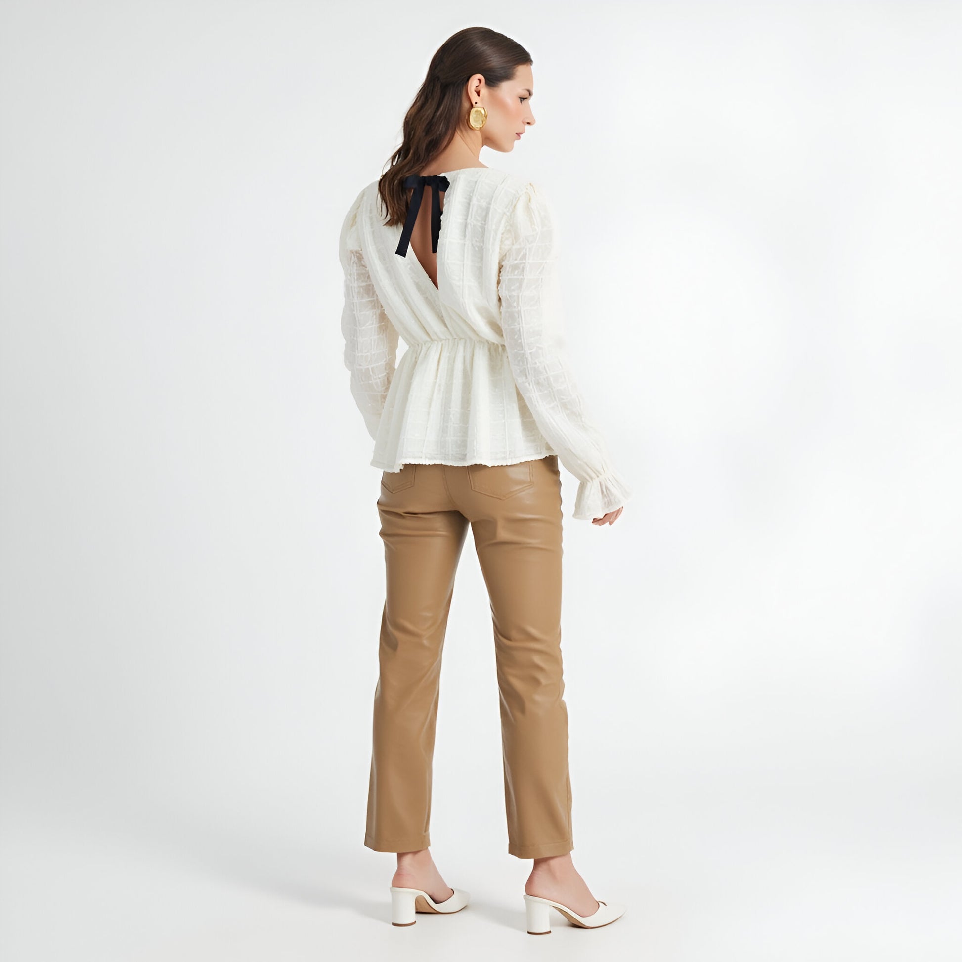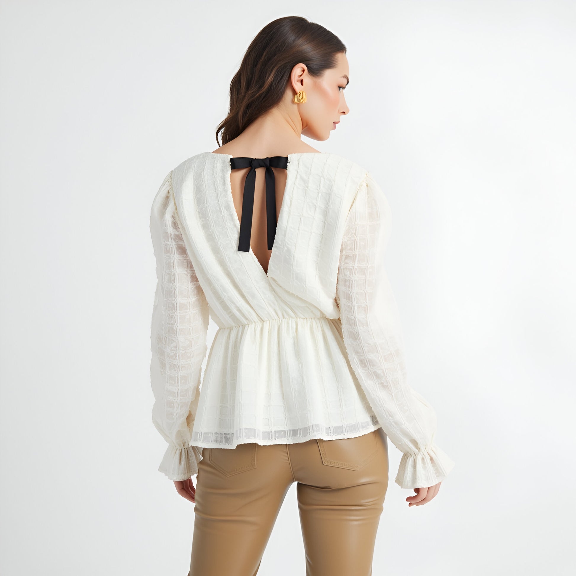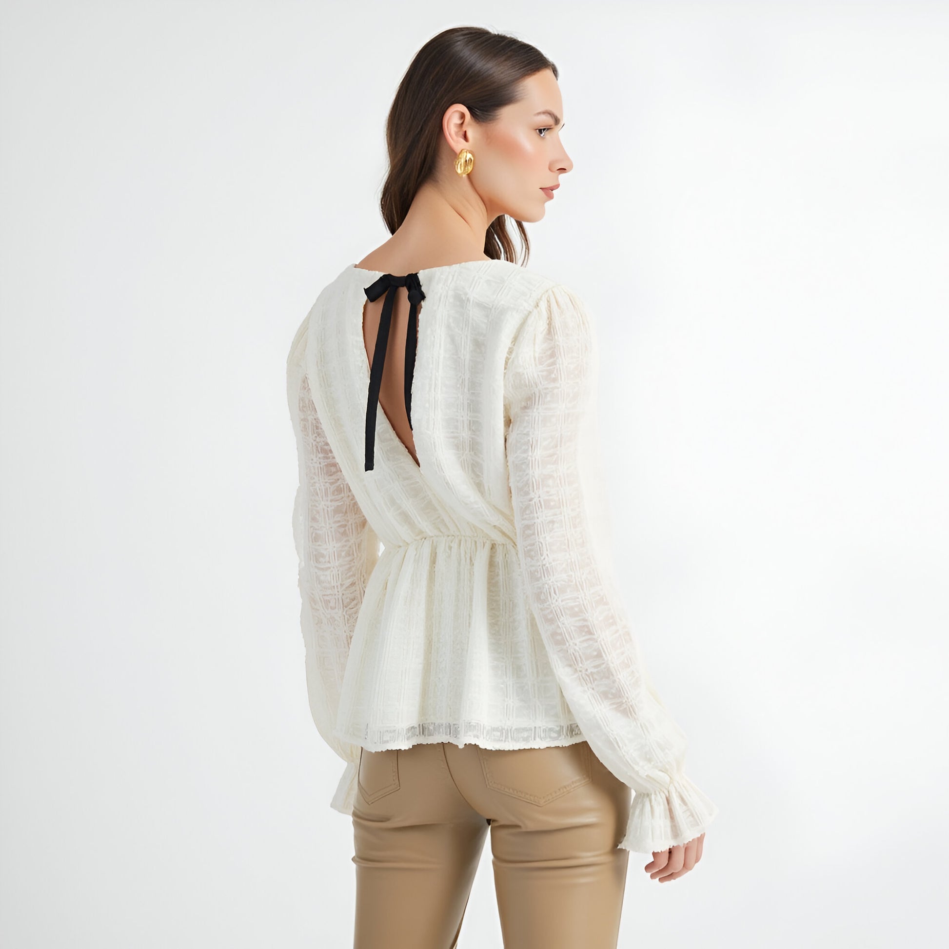 This elegant blouse is designed with a subtle textured pattern and a flattering peplum hem that defines the waist. Sheer long sleeves with gathered cuffs add a touch of softness, while the open back is finished with a contrasting bow tie for a feminine detail. Lightweight and flowy, this top pairs effortlessly with both denim and tailored bottoms. A polished piece that blends modern elegance with romantic charm.