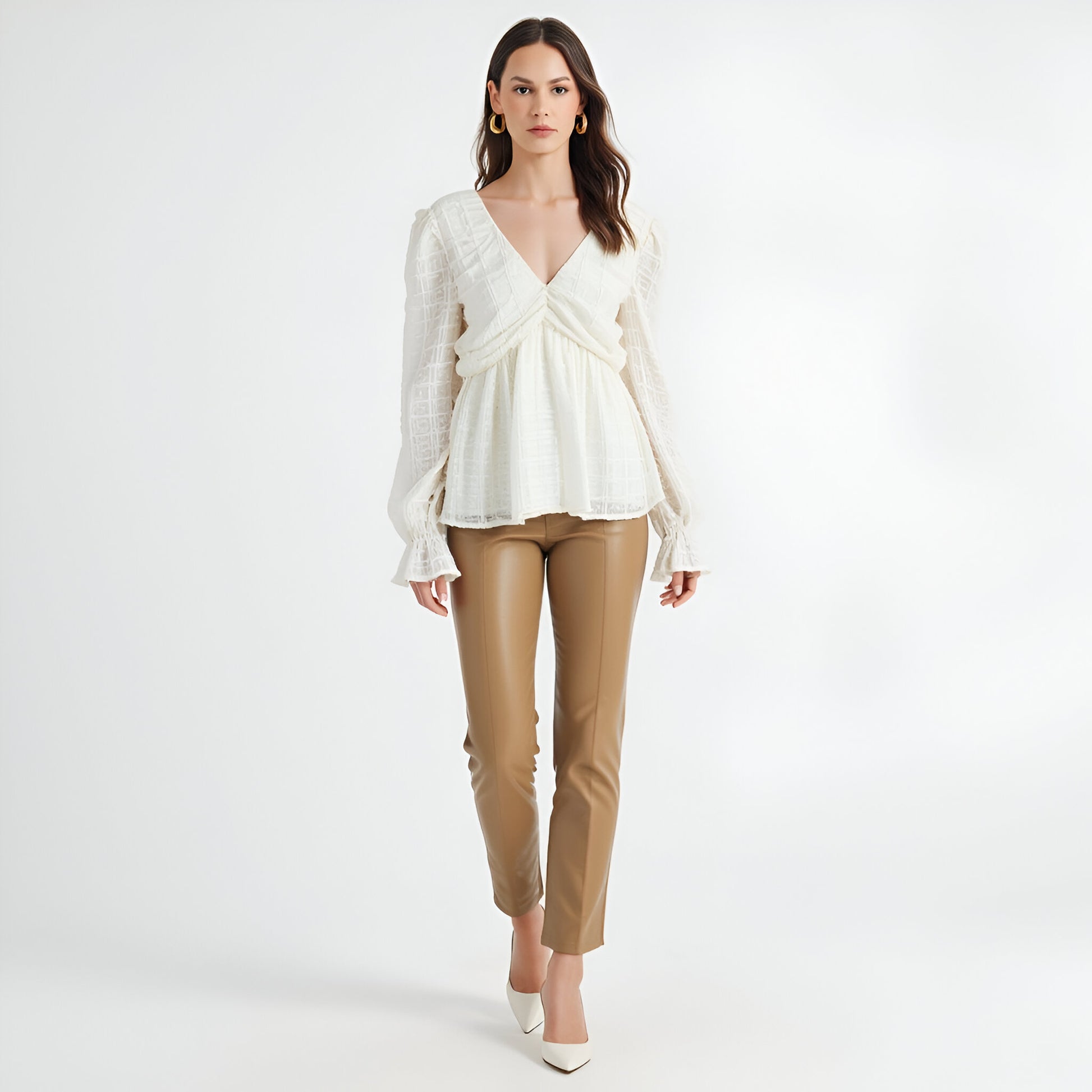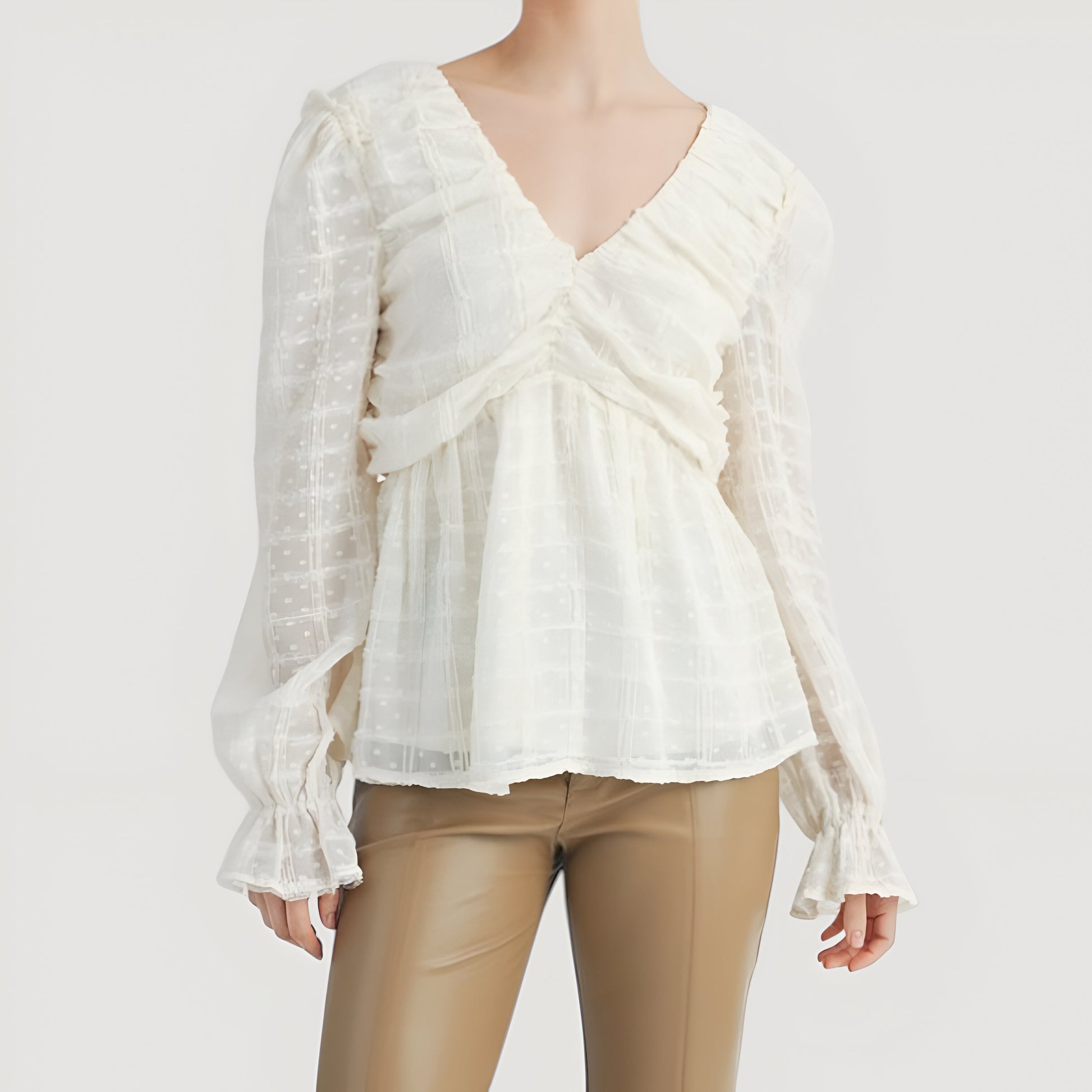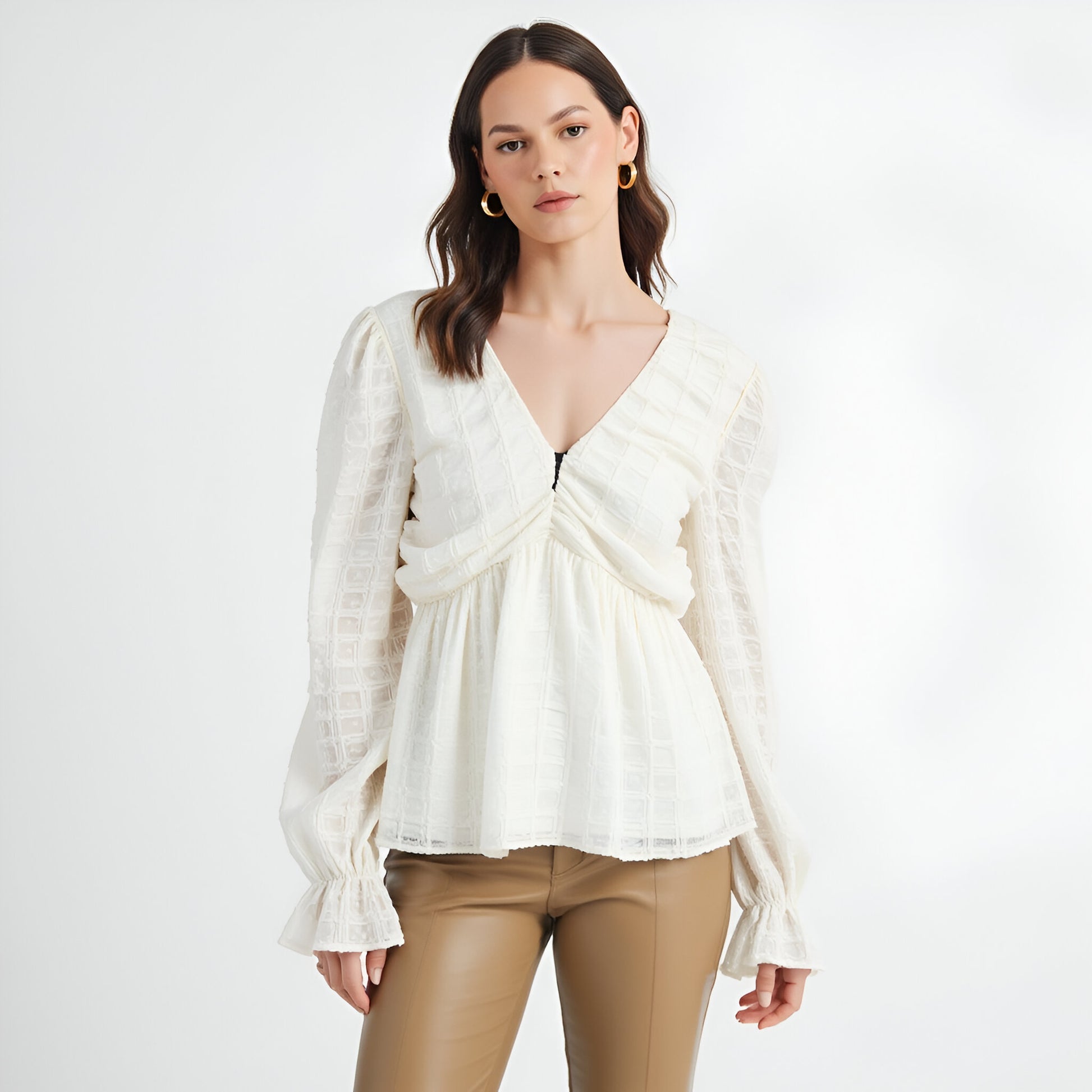 This elegant blouse is designed with a subtle textured pattern and a flattering peplum hem that defines the waist. Sheer long sleeves with gathered cuffs add a touch of softness, while the open back is finished with a contrasting bow tie for a feminine detail. Lightweight and flowy, this top pairs effortlessly with both denim and tailored bottoms. A polished piece that blends modern elegance with romantic charm.