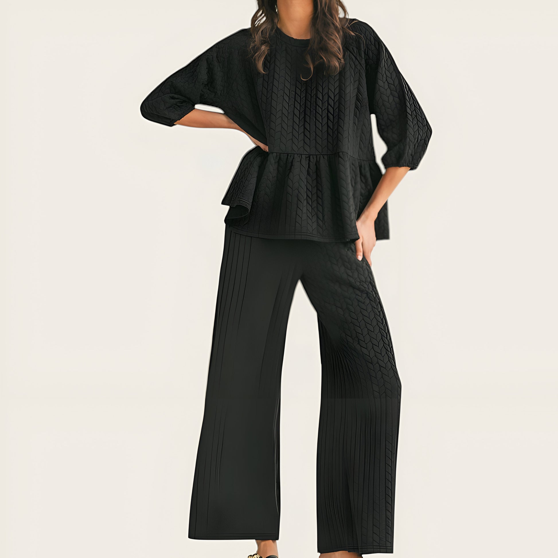 Textured Peplum Top and Wide-Leg Pant Set with Relaxed Silhouette