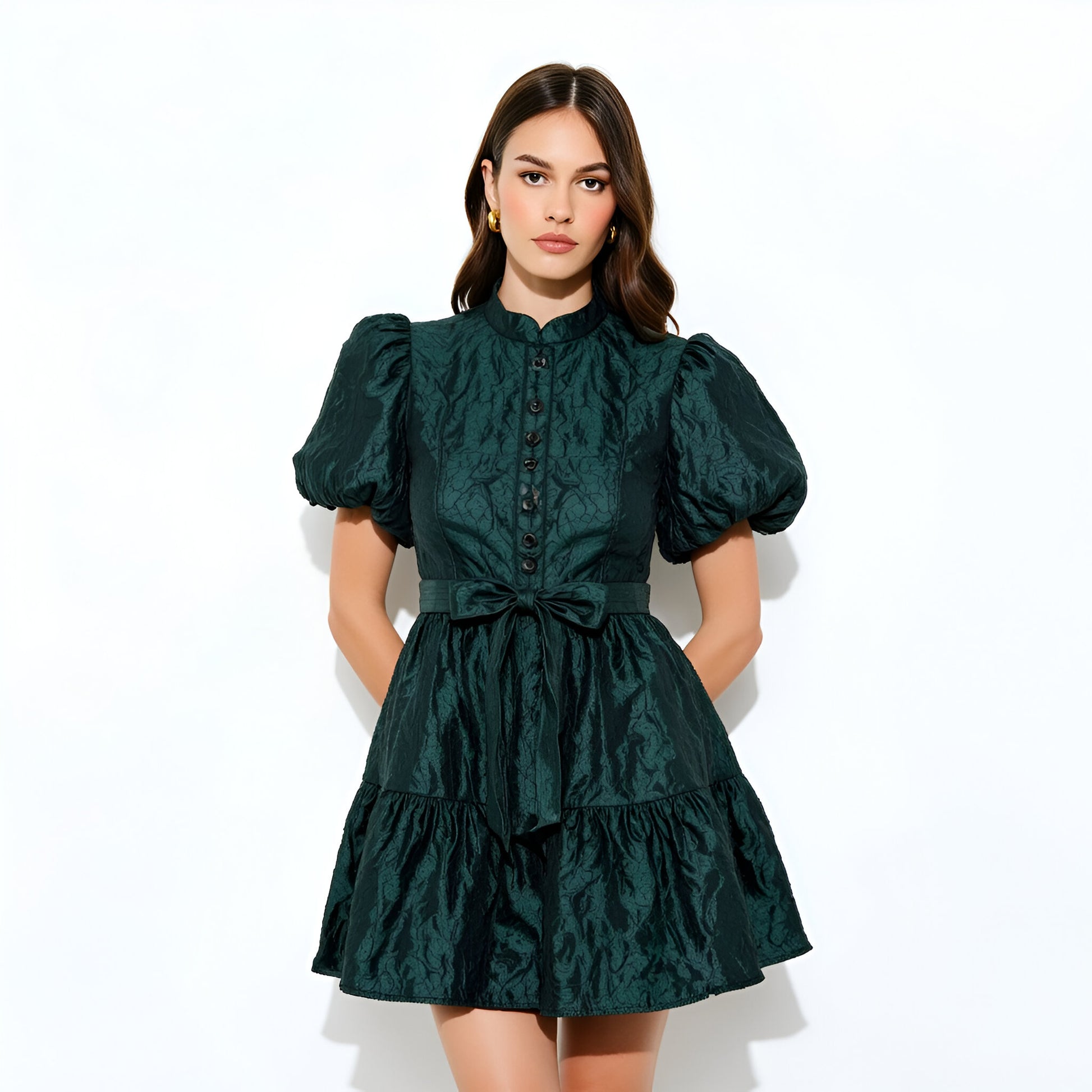A romantic update to the classic mini dress, this textured puff sleeve style is crafted from a dimensional floral jacquard for a rich, elevated look. The high neckline and covered button front bring timeless charm, while the puff sleeves add a soft, voluminous silhouette. A self-tie belt cinches the waist for a flattering fit, and the tiered skirt offers graceful movement with every step. Perfect for making an effortlessly polished impression.