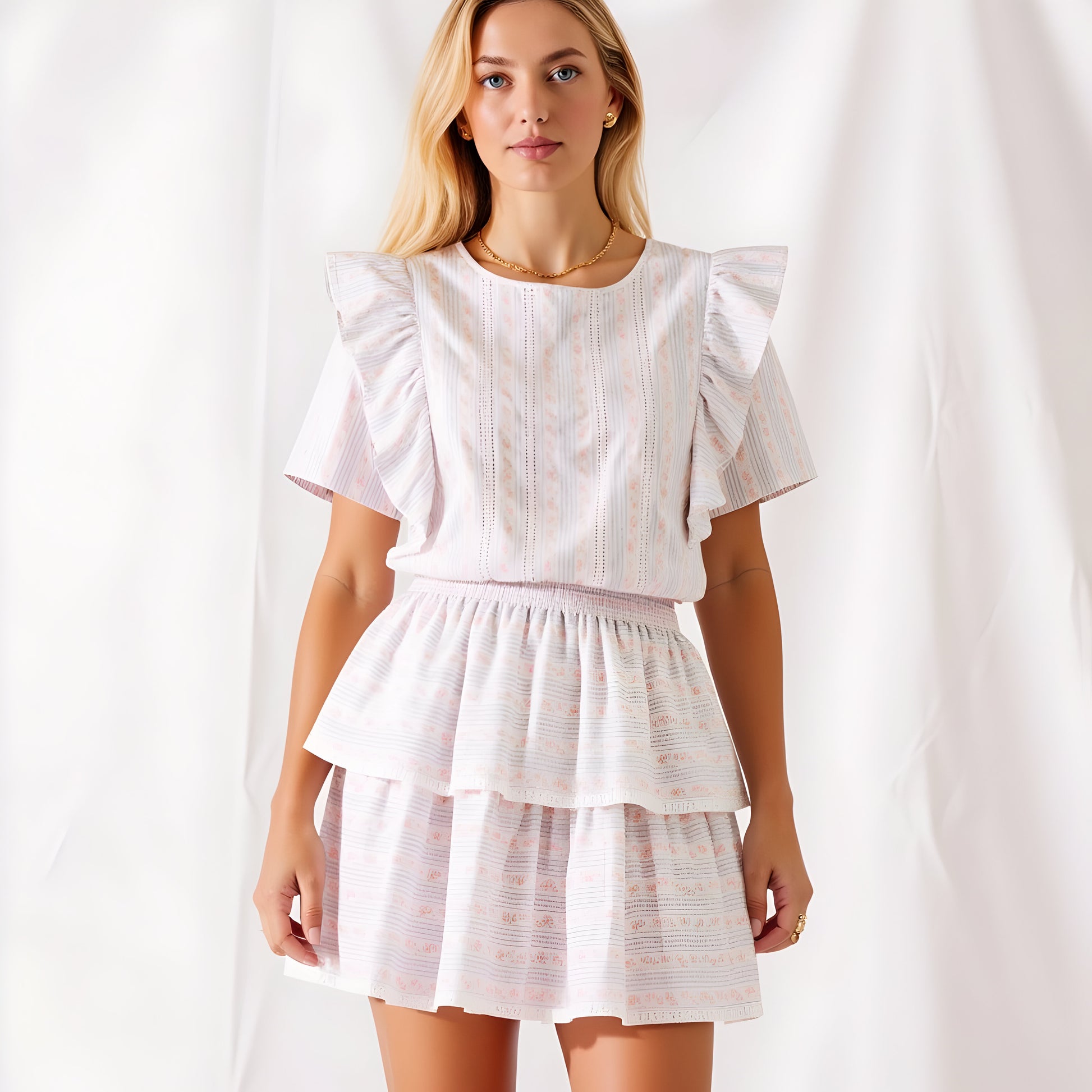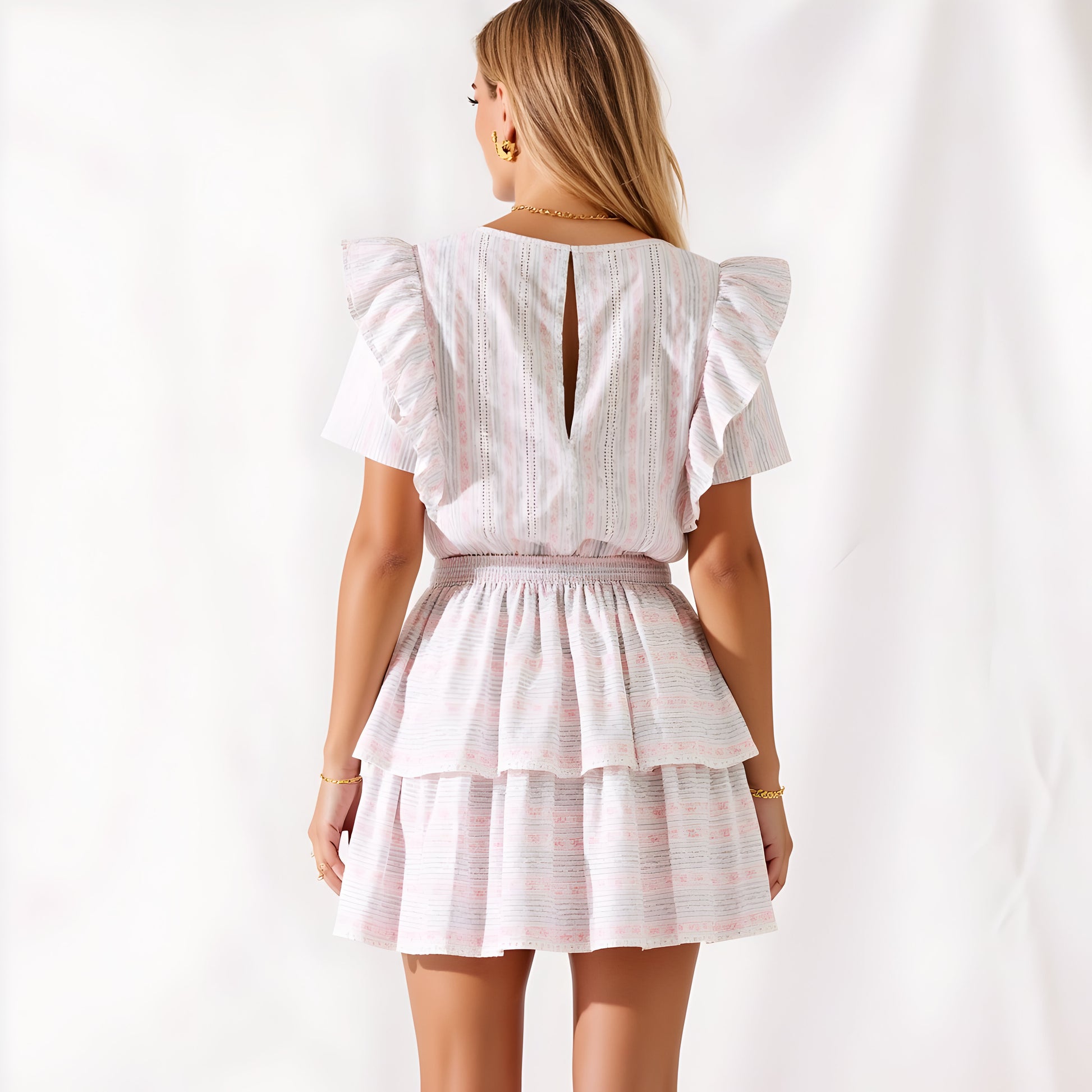 This Modenaire mini dress features fluttery ruffle sleeves and a flattering cinched waist, creating a soft, feminine silhouette. The subtle stripe pattern and delicate texture add dimension to the look, while the tiered hem brings movement and charm. An effortless style that blends casual ease with elevated detailing.