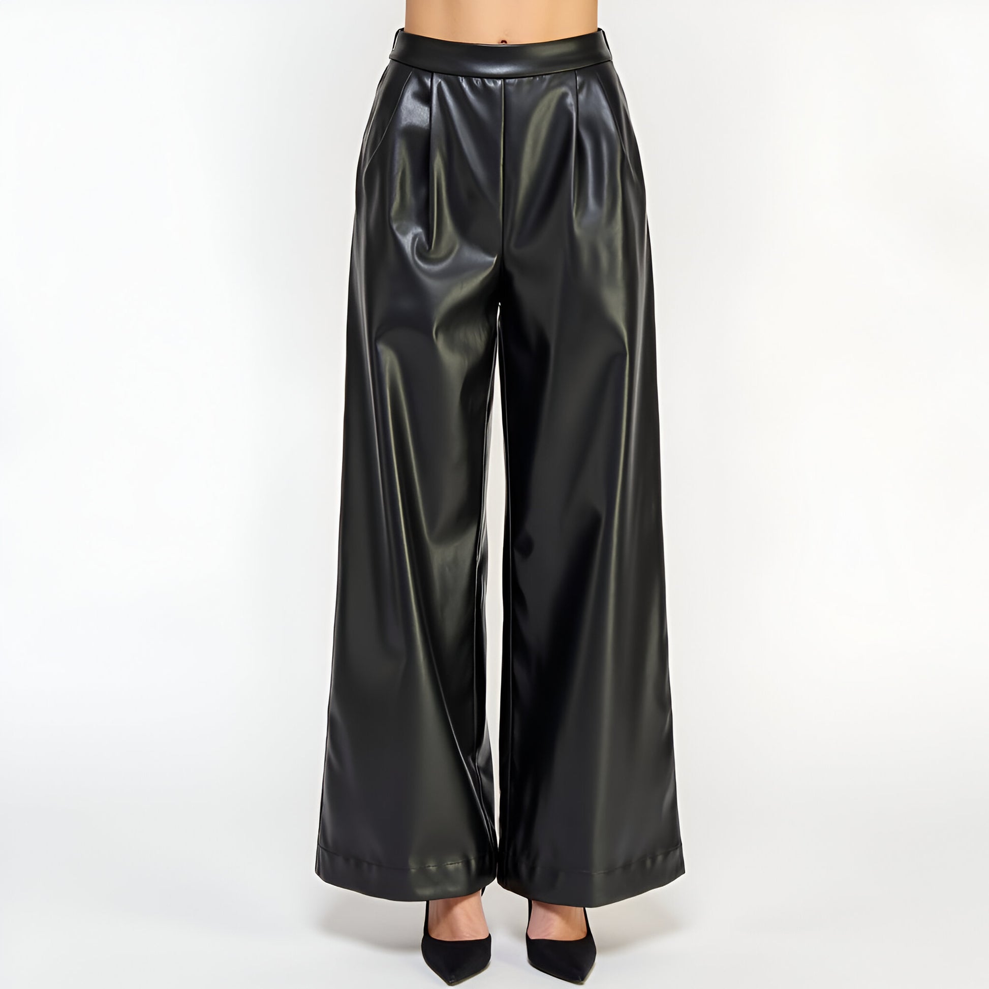 Crafted in luxe faux leather, these wide-leg pants deliver bold, modern style with a polished high waist and dramatic silhouette. The smooth, glossy finish and subtle seam detailing elevate their statement appeal, while side pockets add practical function. Pair with a fitted top or cozy knit for a look that transitions effortlessly from day to night. Flattering, comfortable, and designed for all-day confidence.