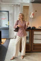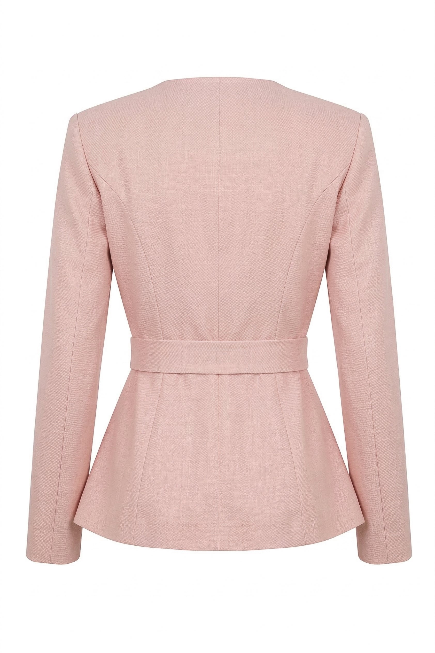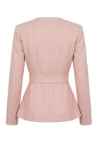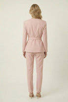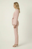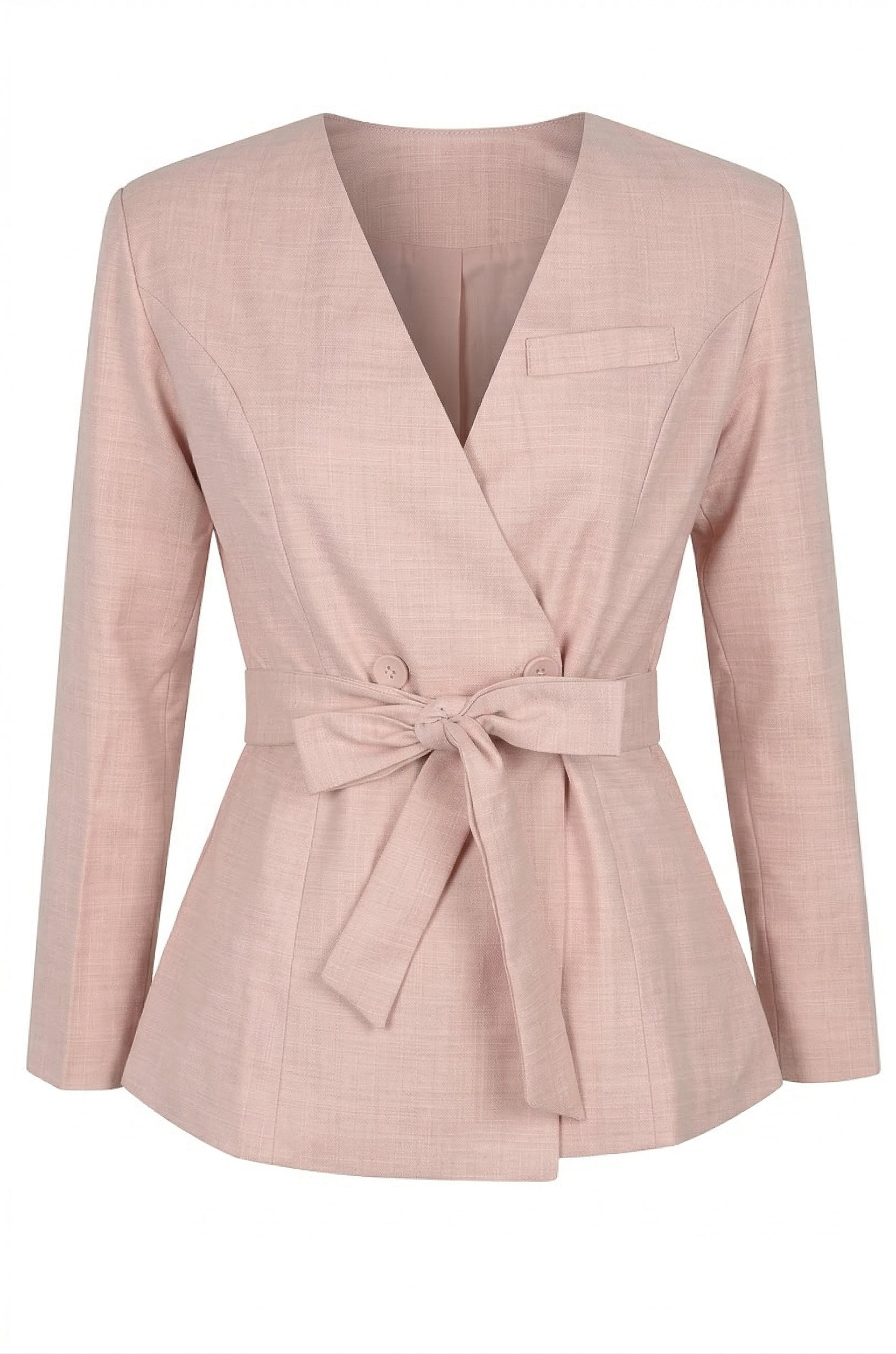 This wrap-style blazer features a clean, tailored silhouette with a softly structured finish for a refined, modern look. Designed with a deep V neckline and subtle double-button detailing, it creates a flattering, contoured shape through the bodice. The adjustable waist tie belt enhances definition while adding a soft, feminine touch. Style it with matching trousers or denim for a polished outfit that transitions seamlessly from day to night.